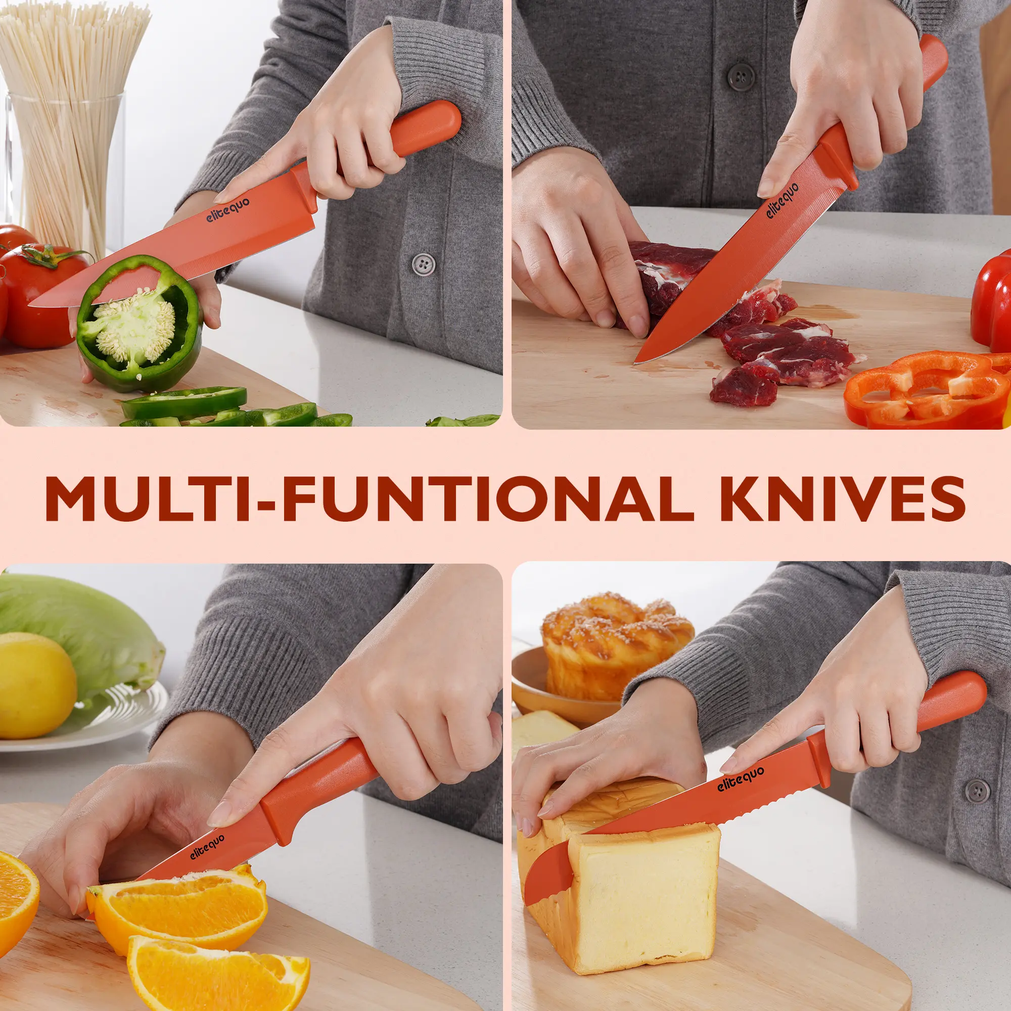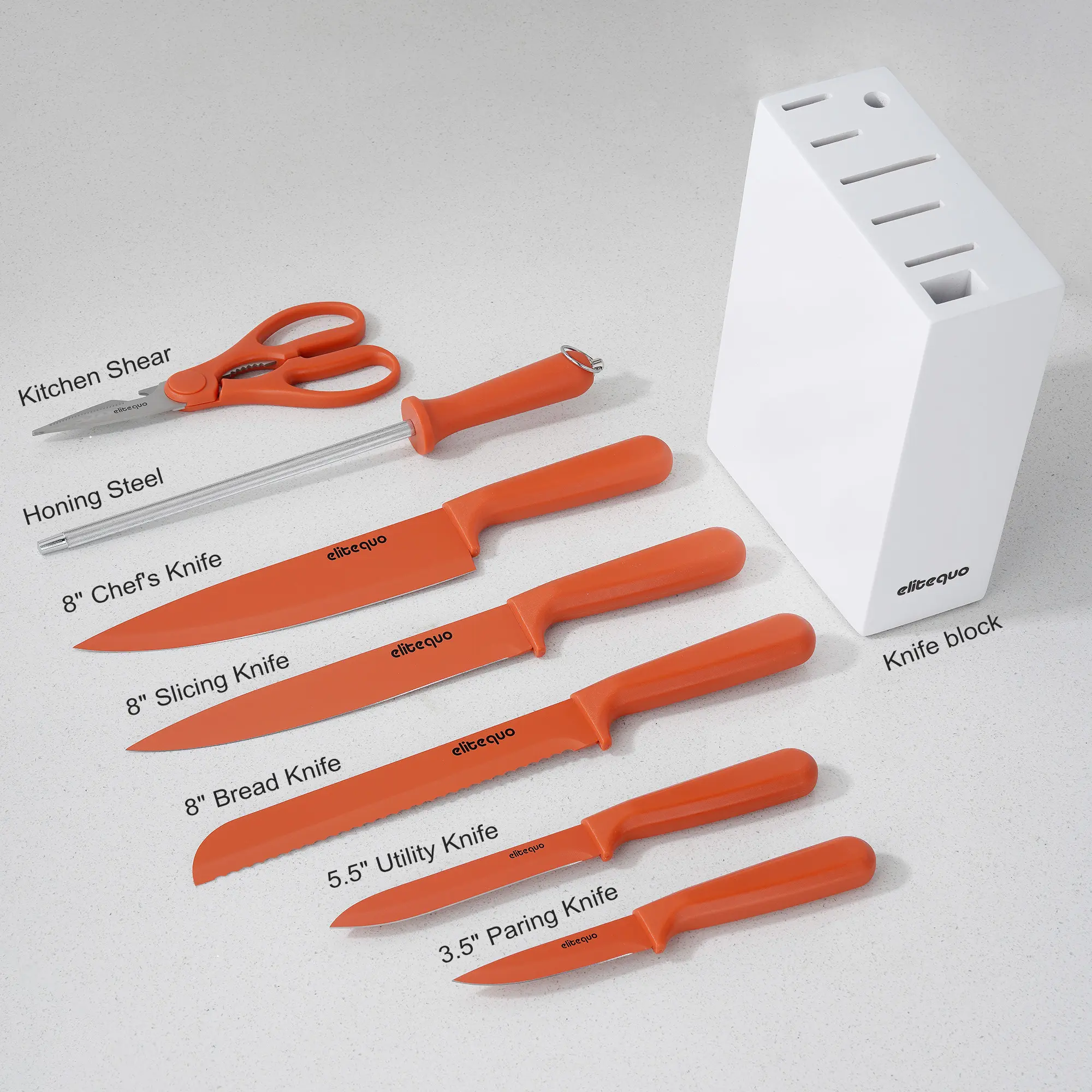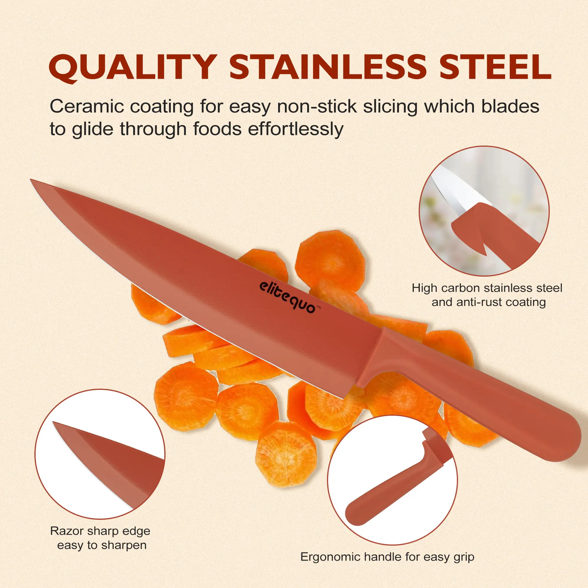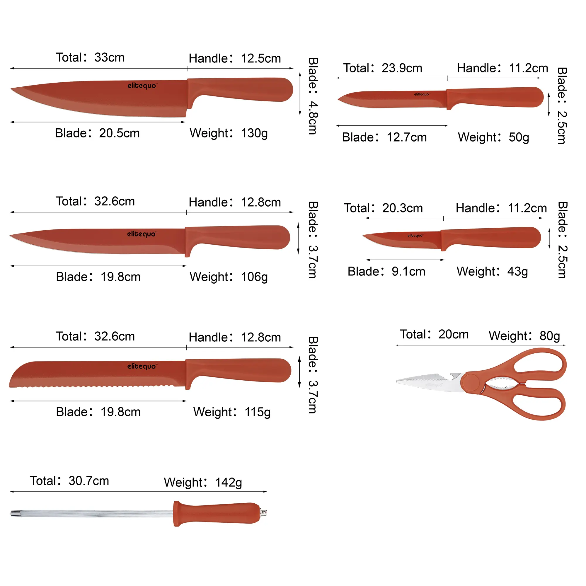 Elevate your kitchen with the ELITEQUO 8 Pieces Knife Set with Block, combining style, durability, and practicality in one elegant package.