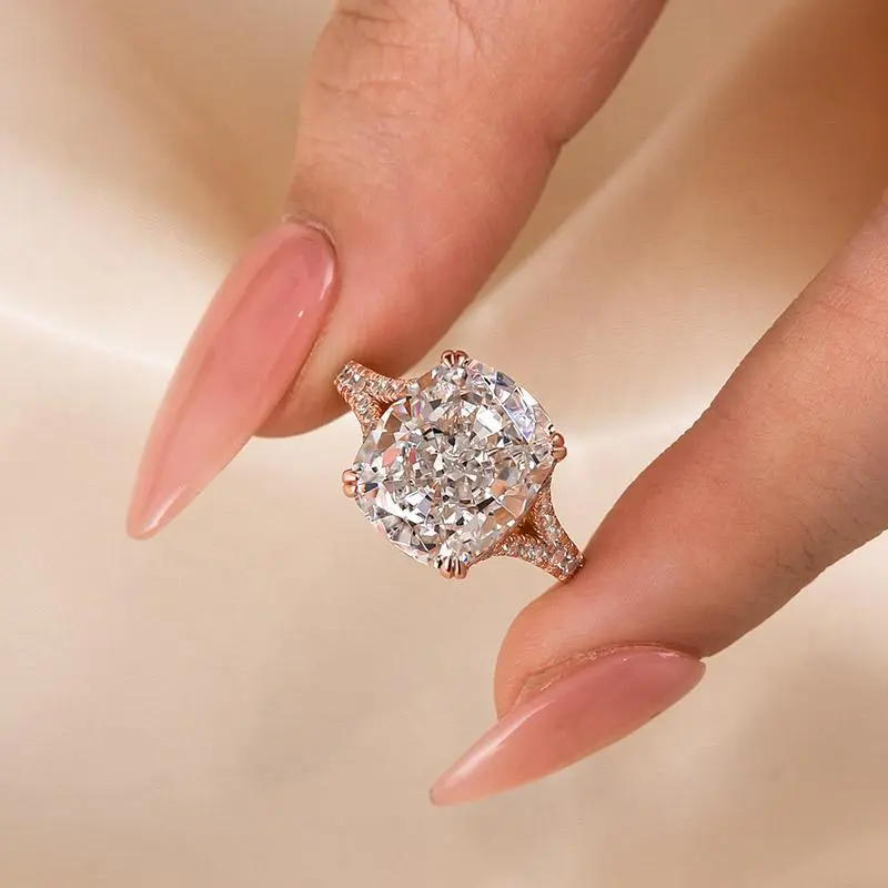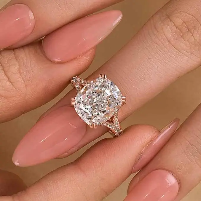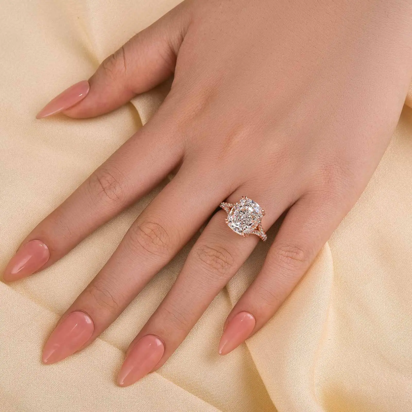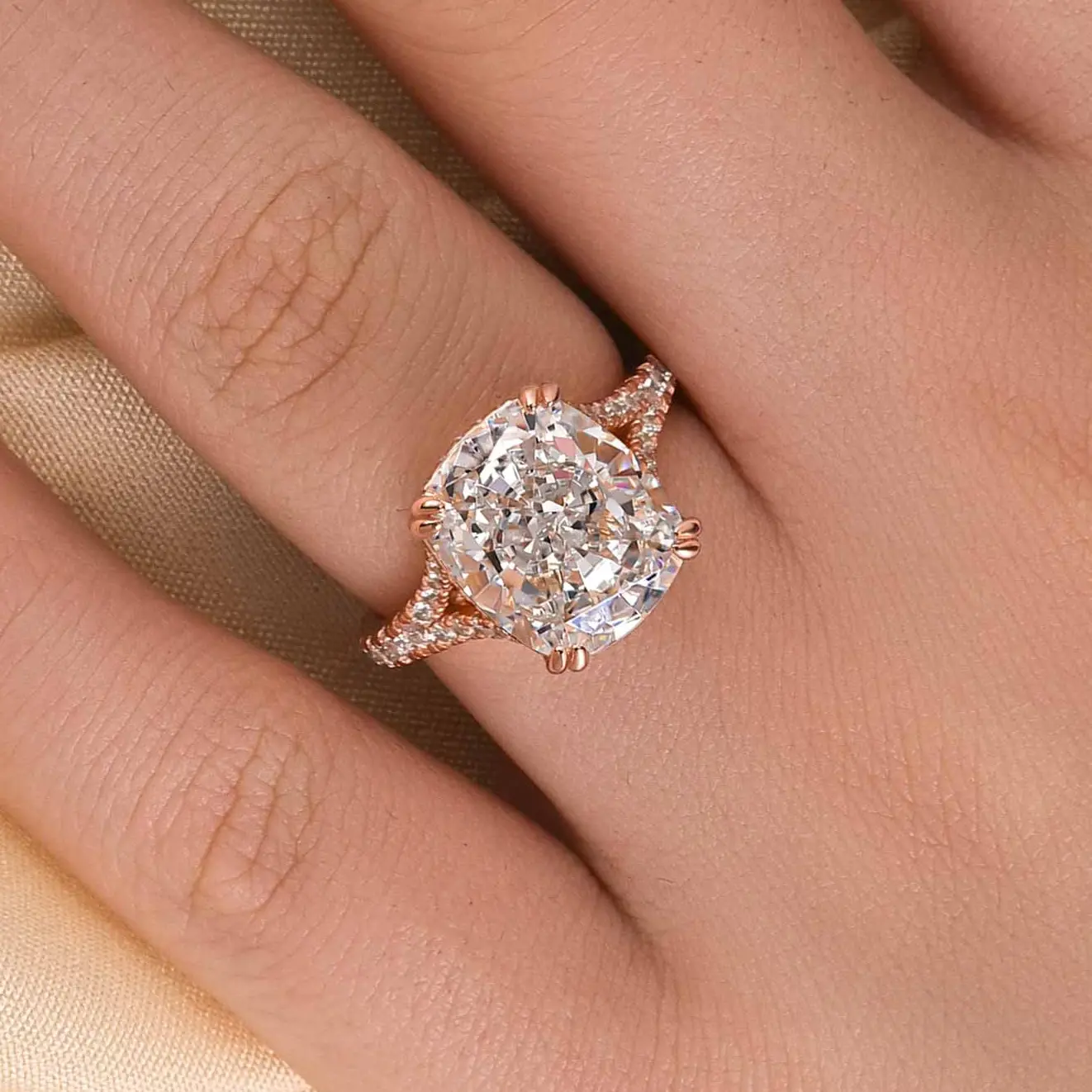 Crafted with precision, this engagement ring boasts an exquisite vintage design that exudes elegance and timeless beauty. Its unique split shank and crushed ice cushion cut create a mesmerizing sparkle that captures the heart.