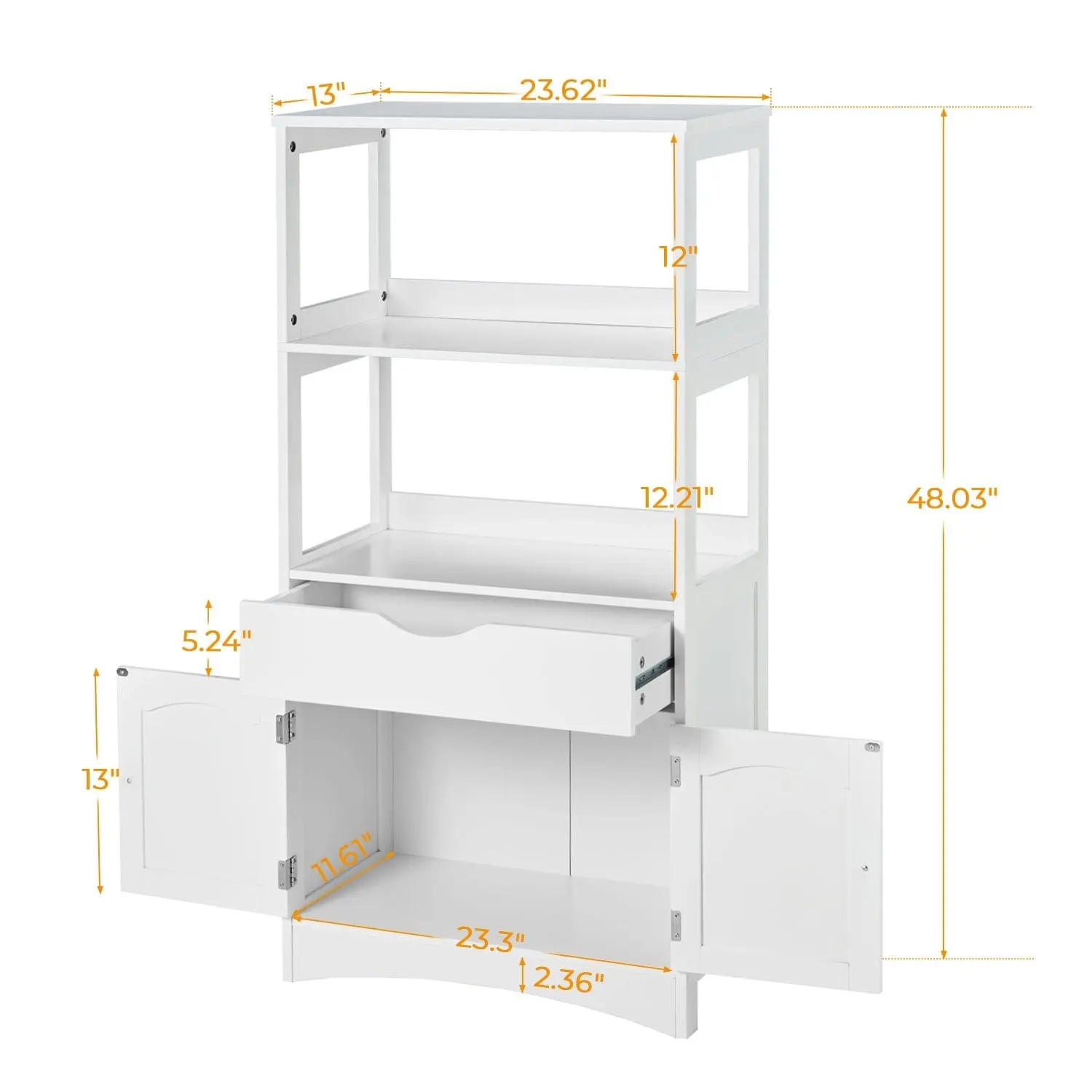 As Bathroom Storage Cabinet: 2 open shelves keep your frequently used items like towels and lotions available for quick access in the morning. 1 drawer and 1 cabinet can help you store toilet paper, dry towels or some fragmented things to keep the bathroom tidy.The top shelf can be used to hold shampoo, body wash, etc.