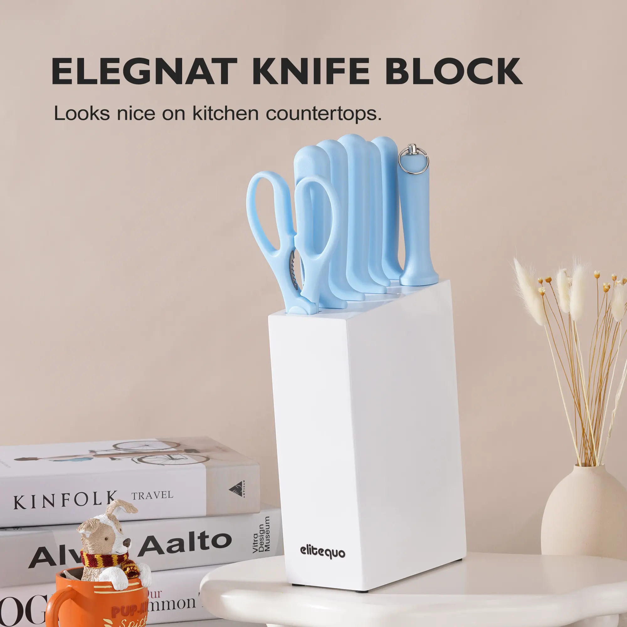 Elevate your kitchen with the ELITEQUO 8 Piece Knife Set, a perfect blend of elegance and functionality. This kitchen knife block set features: