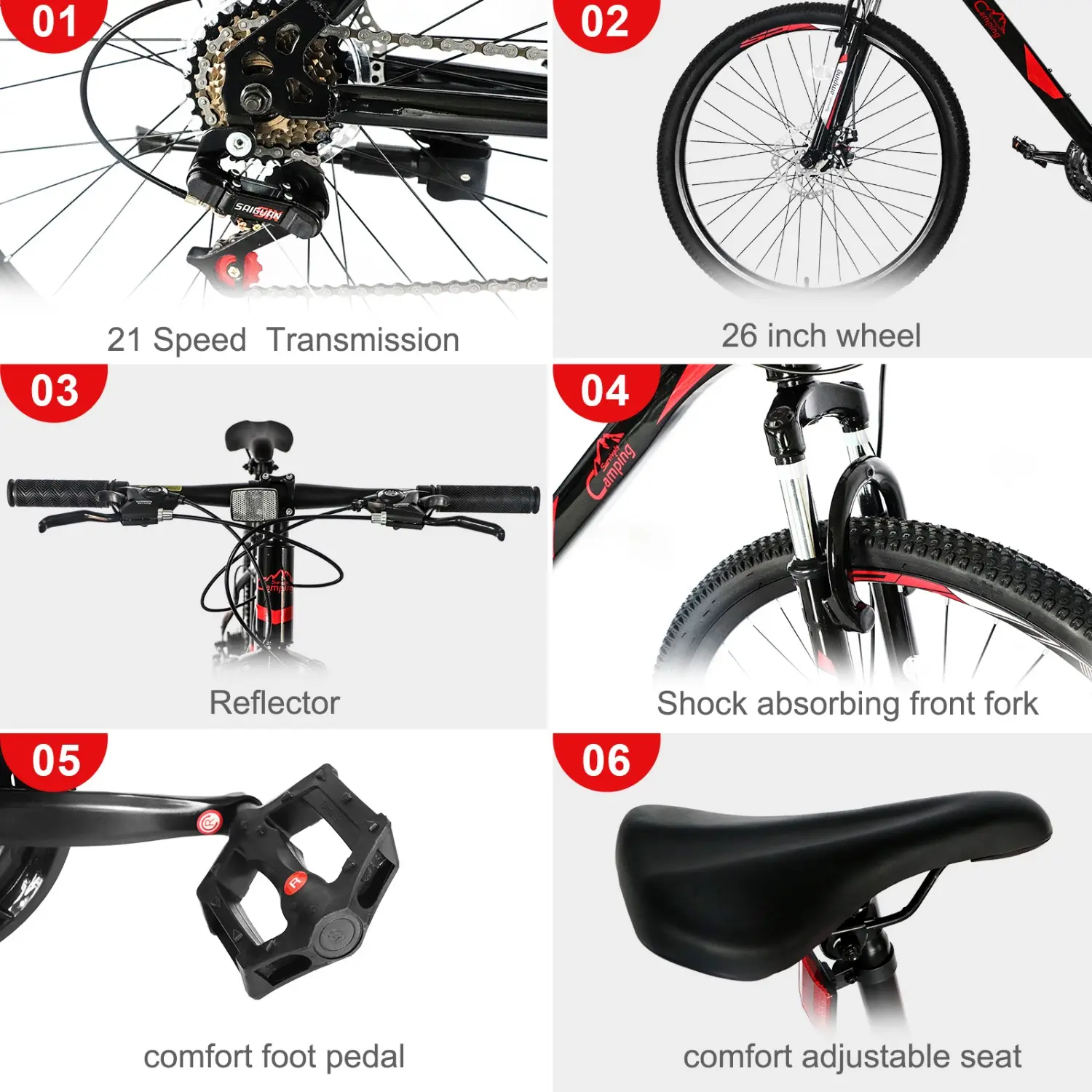 Introductions: Here is an introduction to our CamPingSurvivals 26 Inch 21 Speed Explorer Red Black Mountain Bike. It adopts a double-disc brake system, which brakes sensitively and makes driving more stable and reliable. It also uses a thick shock-absorbing front fork, which can comfortably cope with various road sections and has a good shock-absorbing effect. What are you waiting for? Order now!