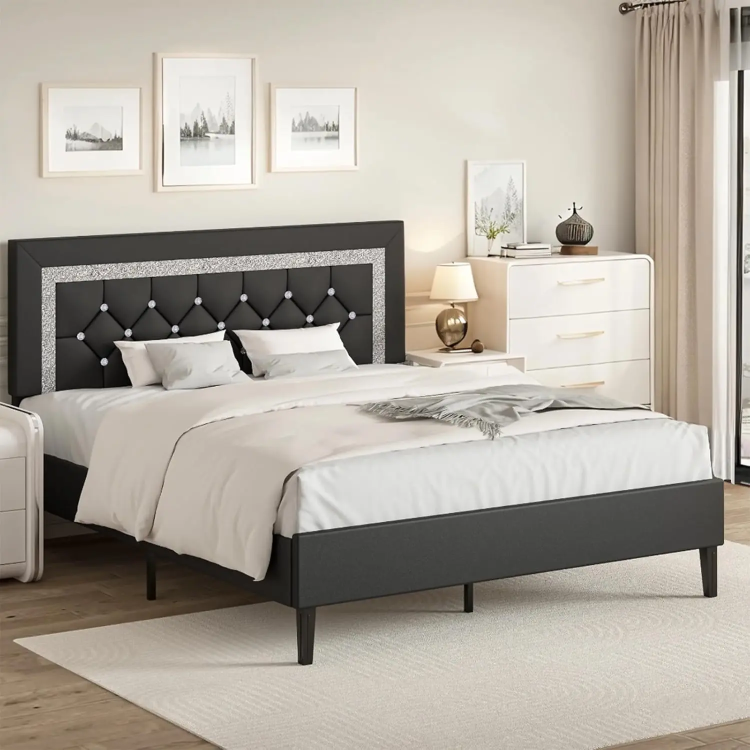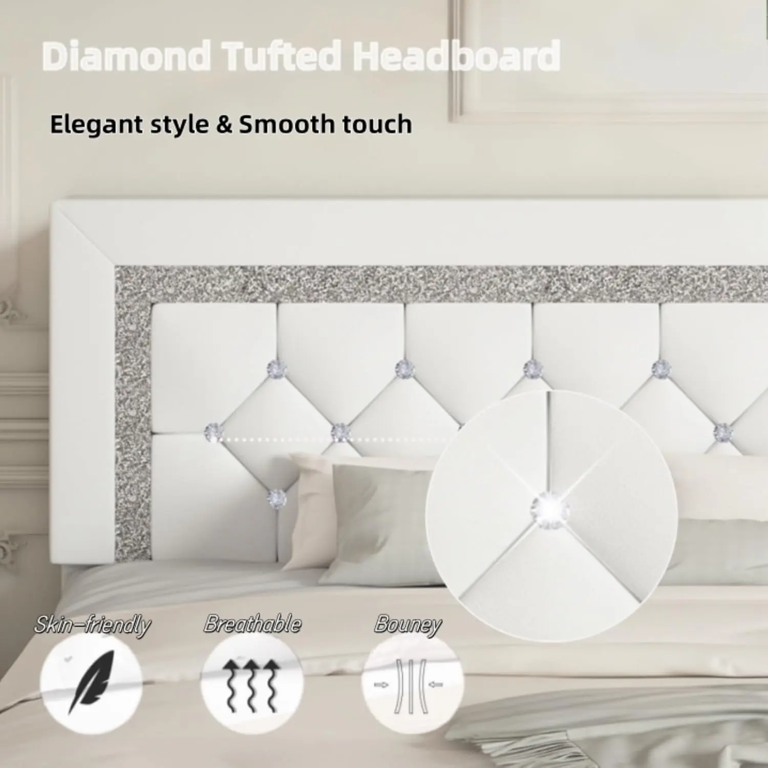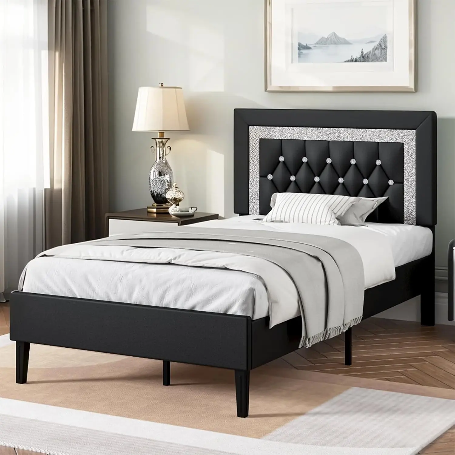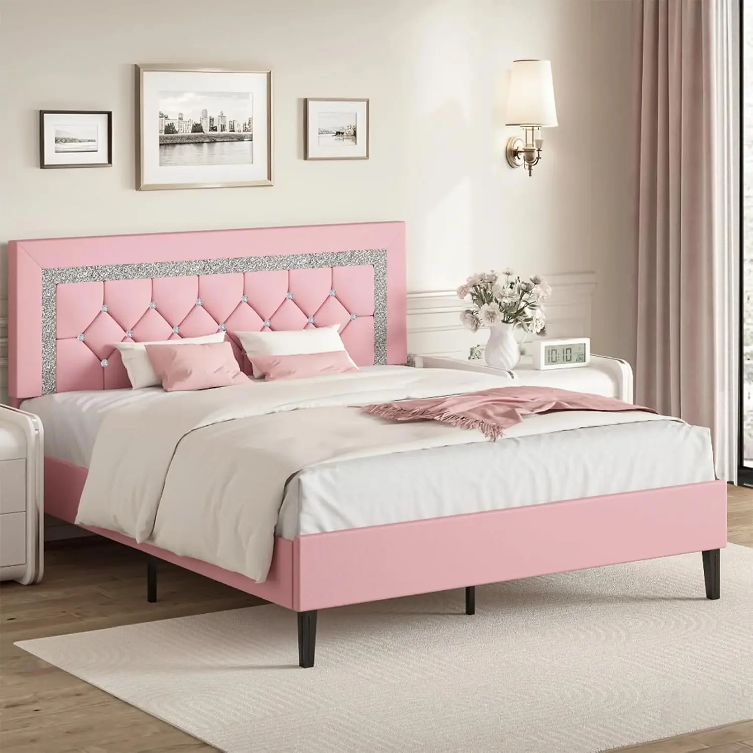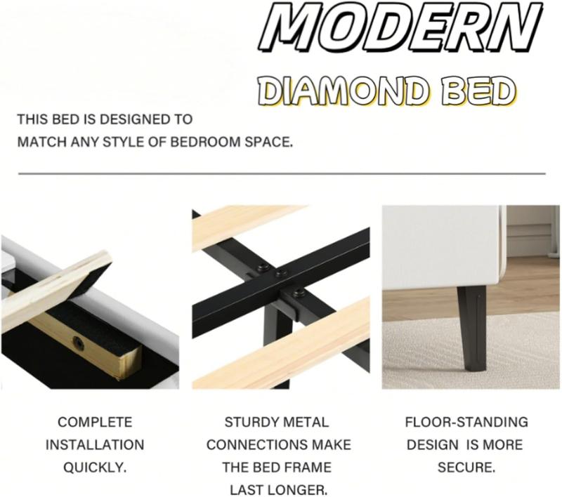 ·Stylish & Elegant--The bed frame has a regal diamond finish, making it both stylish and comfortable, at the same time, because of the elegant design of the head of the bed, the diamond bed frame will be loved by boys and girls alike