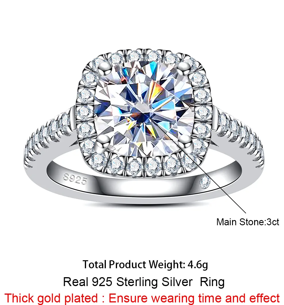 ·【Product Details】:The main stone is a synthetic moissanite that sparkles with unparalleled brilliance. The main stonel weight of 3CT , the ring is available in sizes 4 to 9 to better suit the needs of different people.