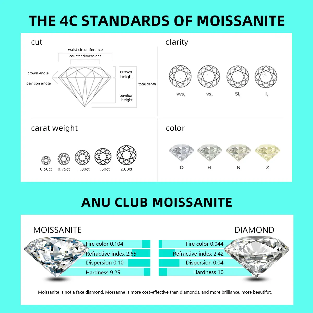 I bought this beautiful 3ct round brilliant Moissanite Grade D Color, VVSI Clarity, from AnuJewel. The matching half eternity band that came with it is .027ct , 1.9mm, round brilliant Moissanite, D, VSSI clarity. Nice Easter present for myself. I love the setting that I will attach pics for. I’m really a Size 7.5 so it is a little big. But AnuJewel jewelry has never failed me.