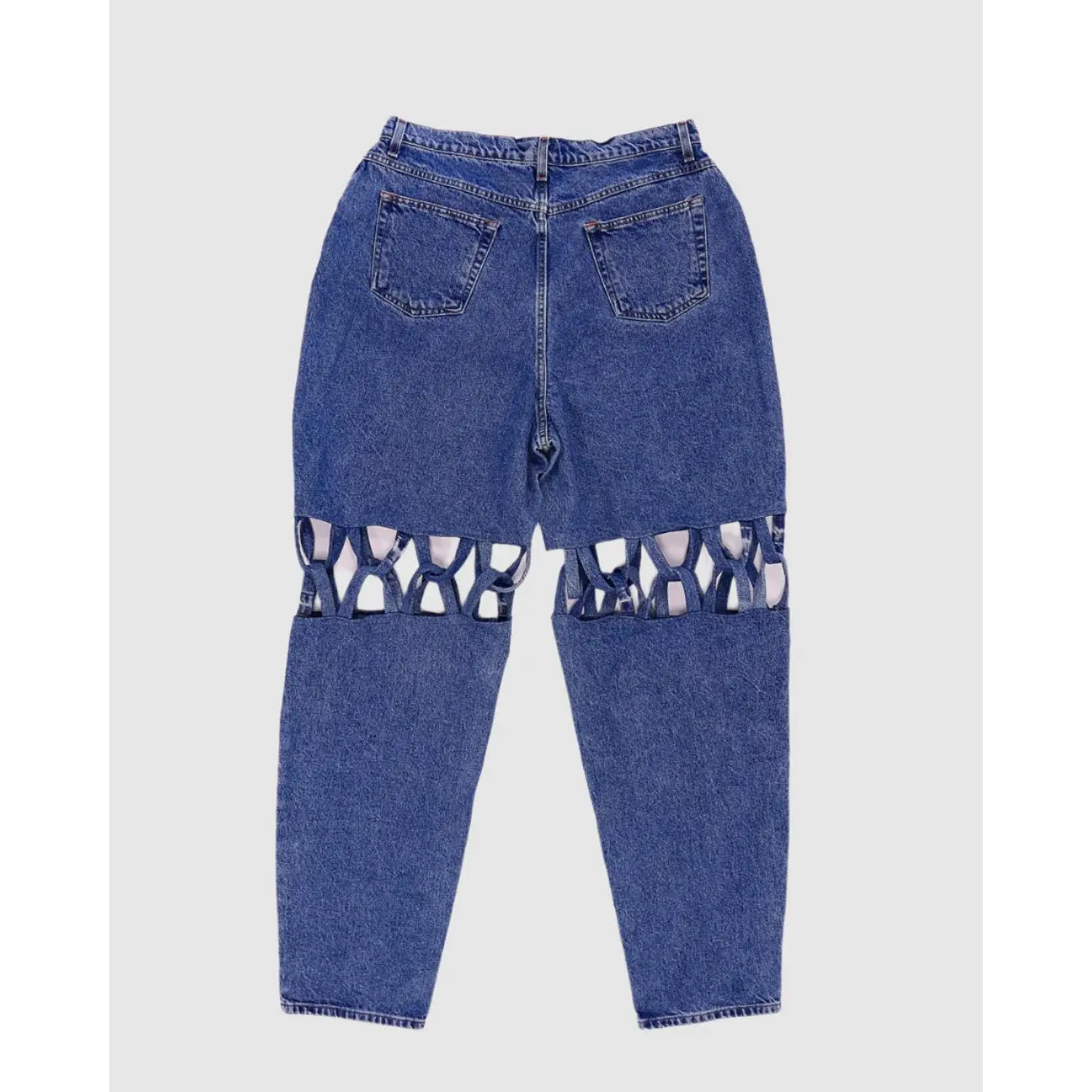 Join the trend and make a statement in these Criss Cross Jeans! Hand crafted from reclaimed jeans, featuring bold criss cross straps and a high-waisted fit, these jeans will turn heads and have your friends in awe. Be daring and make a lasting impression!