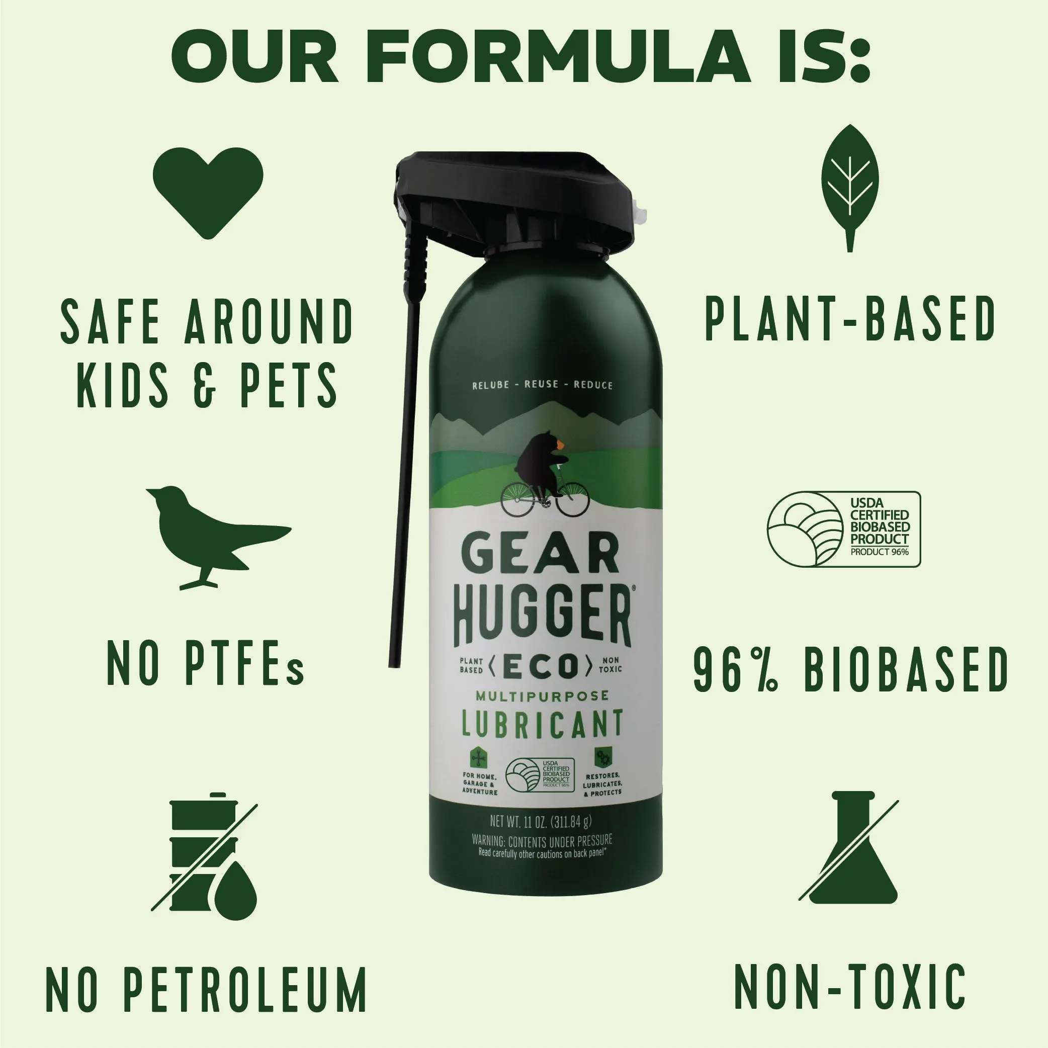 With 3x the lubricating power of petroleum-based products and none of the harsh fumes, Gear Hugger provides a USDA Certified 96% Bio-Based solution with a two-way nozzle for unparalleled performance and safety.