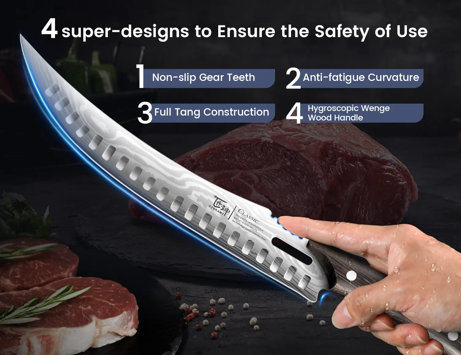 ·Tapered blade tip design allows for boning tasks: This design involves gradually narrowing the blade towards the tip, resulting in a sharp and pointed end that can easily maneuver around bones and joints. By using a knife with a tapered blade tip, can more effectively separate meat from bone, trim fat, and create clean cuts. This feature is particularly useful for tasks such as filleting fish, deboning poultry, and trimming beef or pork