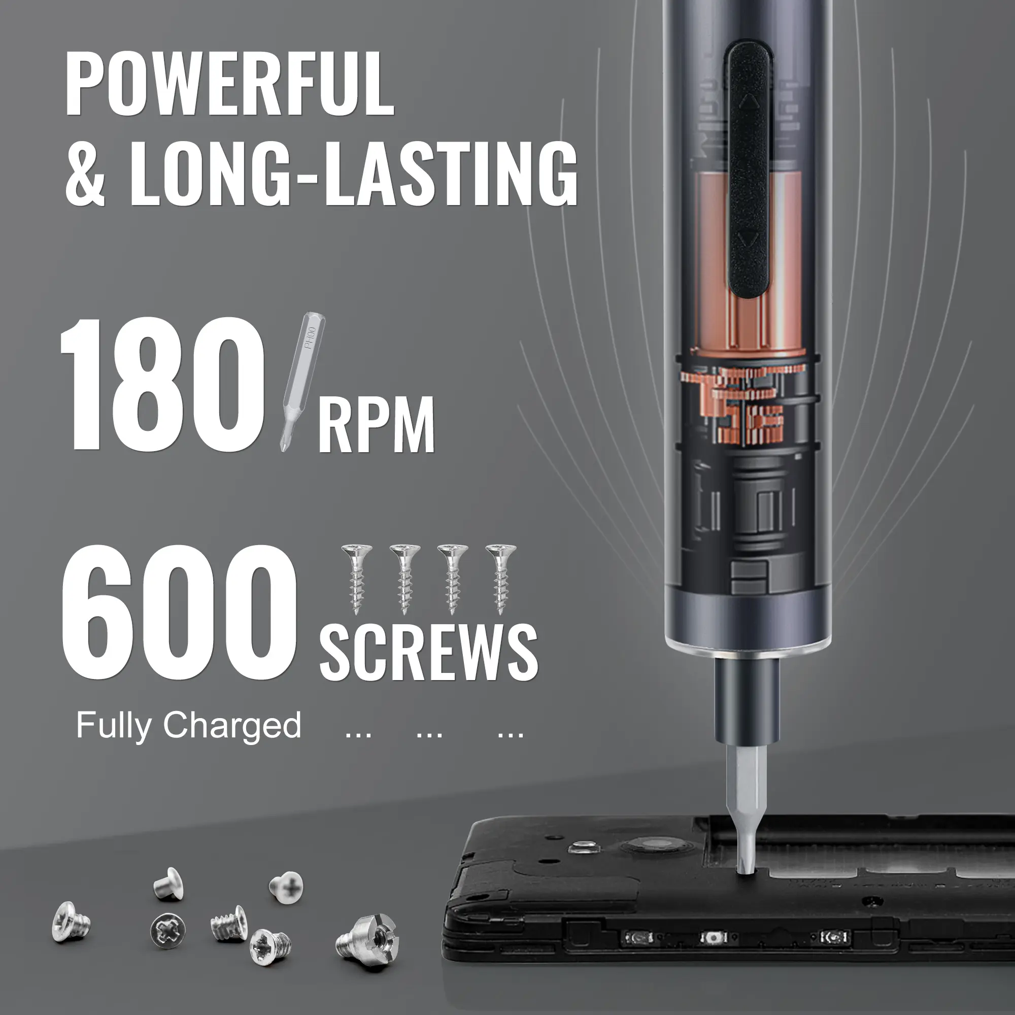 ·Powerful & Long-lasting: The small electric screwdriver comes with a strong motor delivering up to 180 rpm no-load speed. In addition, equipped with a 4.0V 700mAh lithium-ion battery, this automatic screwdriver can work continuously for tightening 600 screws after fully charged, which makes electronic repair work a breeze