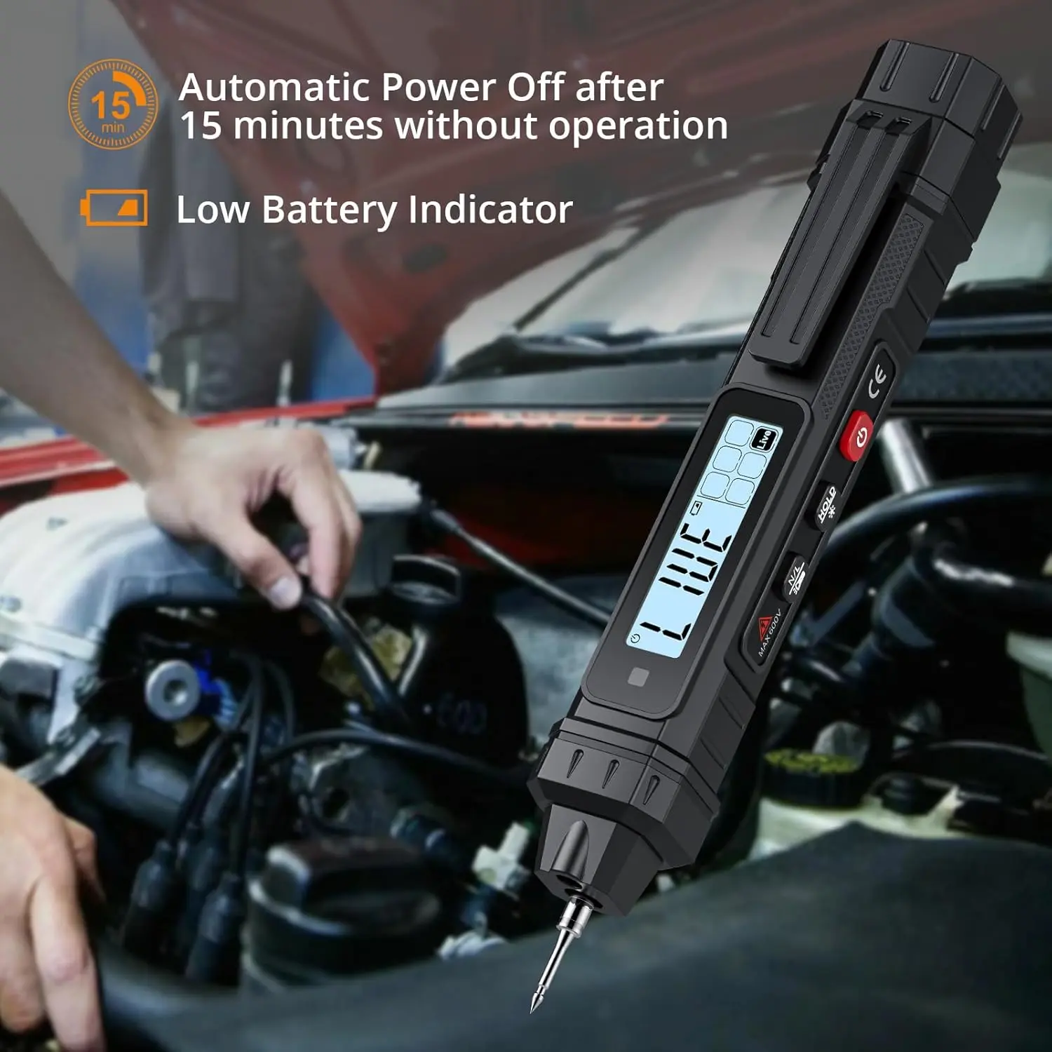 ·【Humanized Functions】The Voltage tester will automatically shut off after 15 minutes of no operation to save power. When the current is low, a low battery indicator will appear on the display. Thanks to the flashlight design, you can use it normally even in the dark environment.