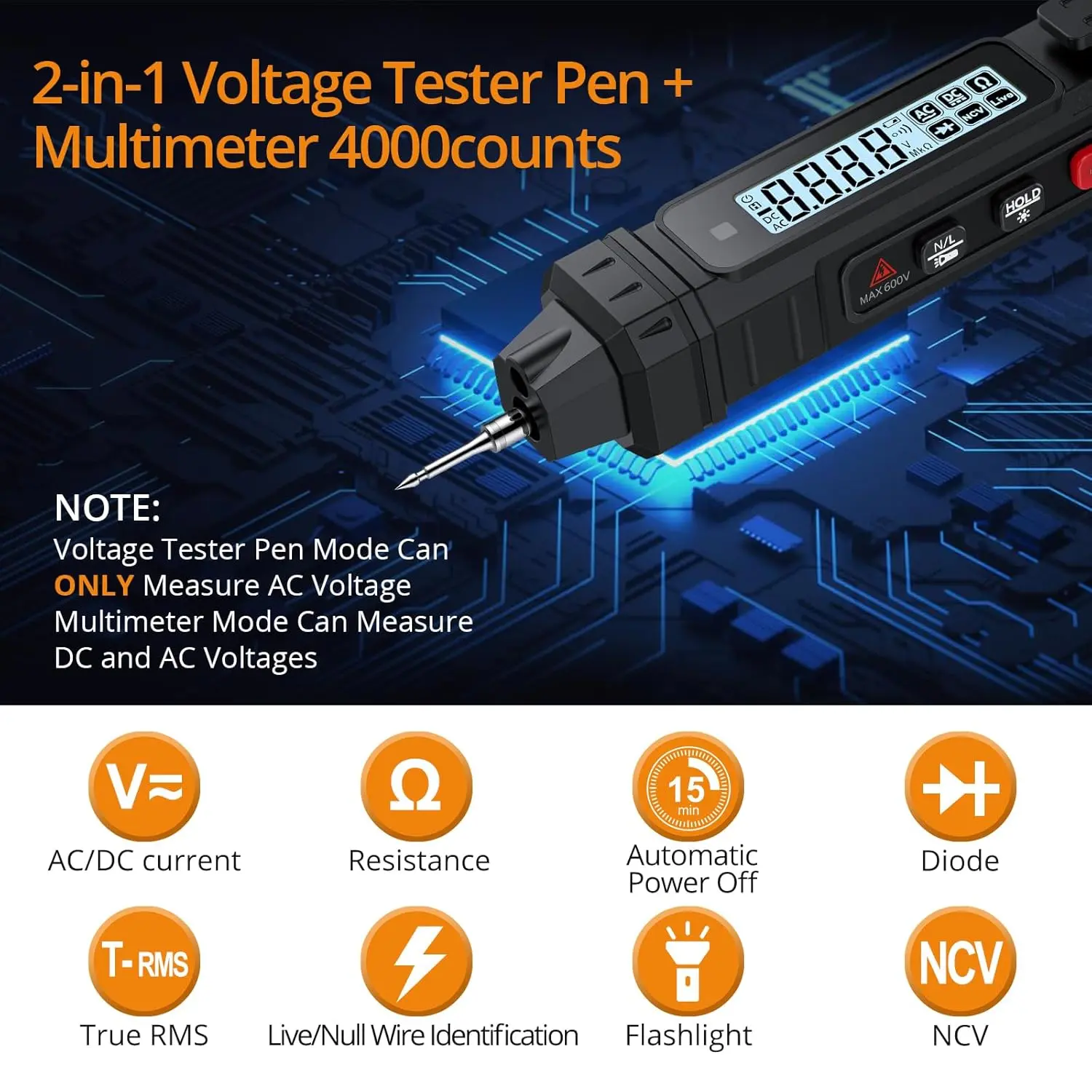 ·【2-in-1 Professional Multimeter】The non-contact voltage tester is a tool that combines the functions of an electric pen and a multimeter. It can not only use the functions of the multimeter (AC/DC voltage, resistance, diode, continuous measurement), but also has the NCV and Null/Live Wire detection function of the electric pen. (Note: Only AC voltage can be measured in voltage pen mode.)