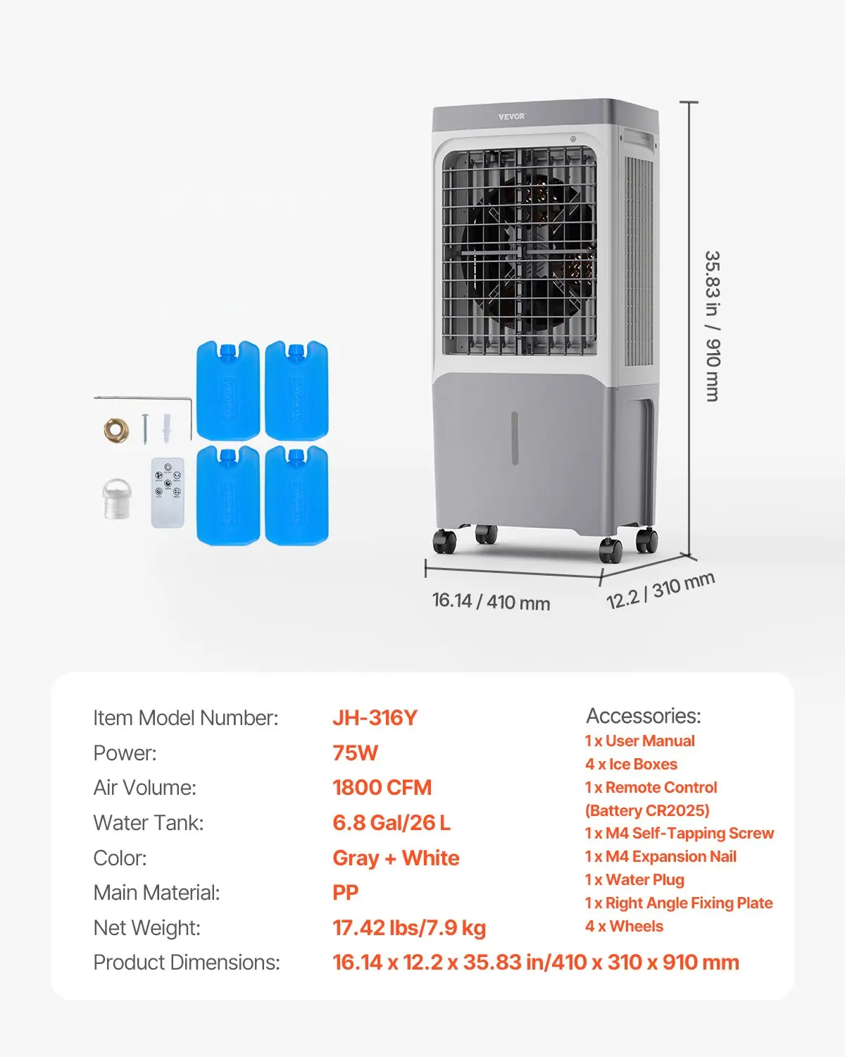 ·Detachable Water Tank: No need to bend over to refill! Simply add water from the top to fill the 6.8 Gal tank, ensuring all-day humidifying or cooling.