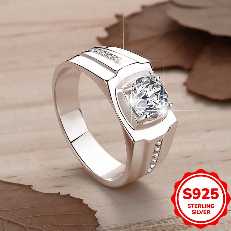 925 Sterling Silver Inset Shiny Synthetic Zircon Ring for Men and Women, 7 Grams, High-Grade Ring Design