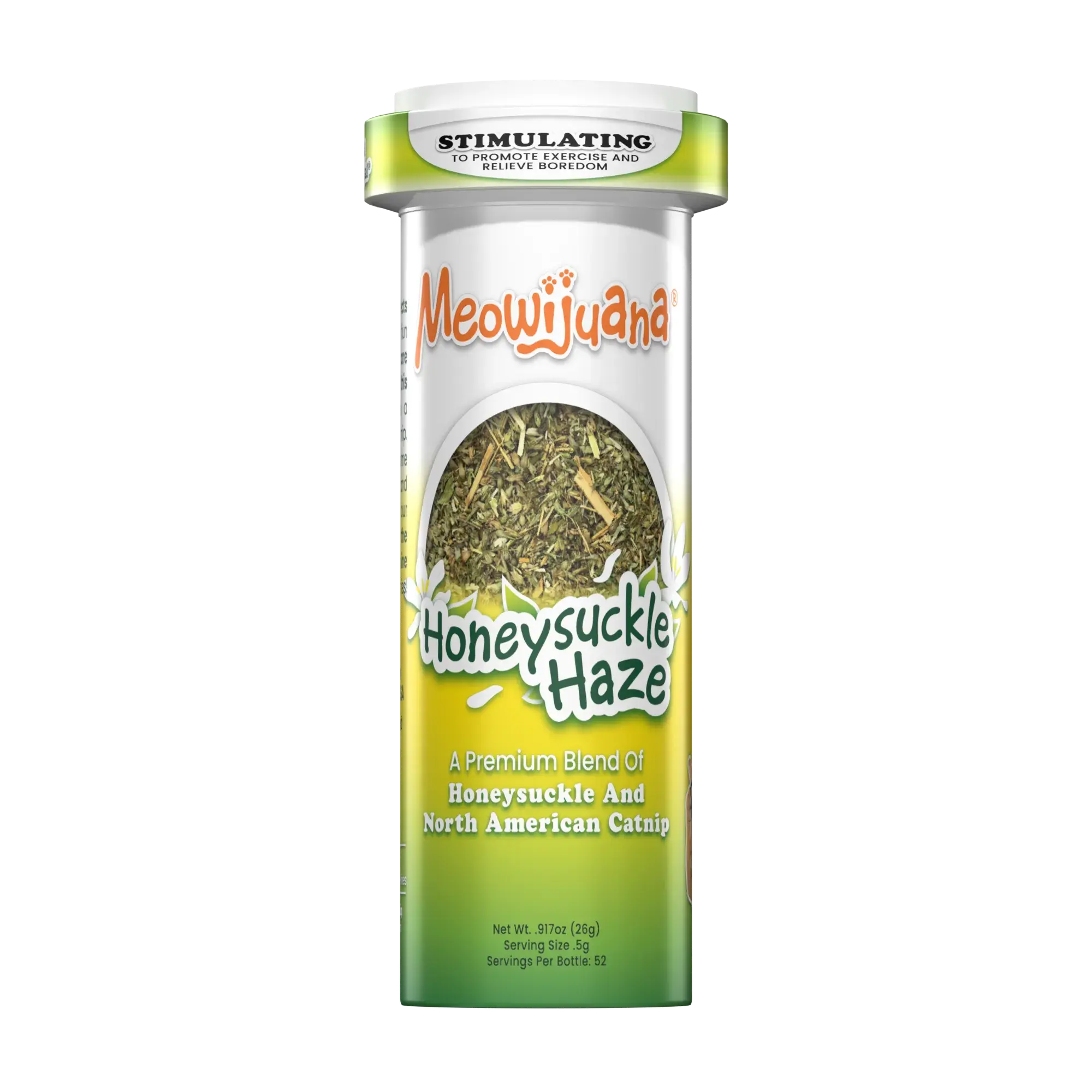 Ingredients & Servings: Contains approximately 52 servings and offers 26 grams of premium catnip (ground) and Tatarian honeysuckle.