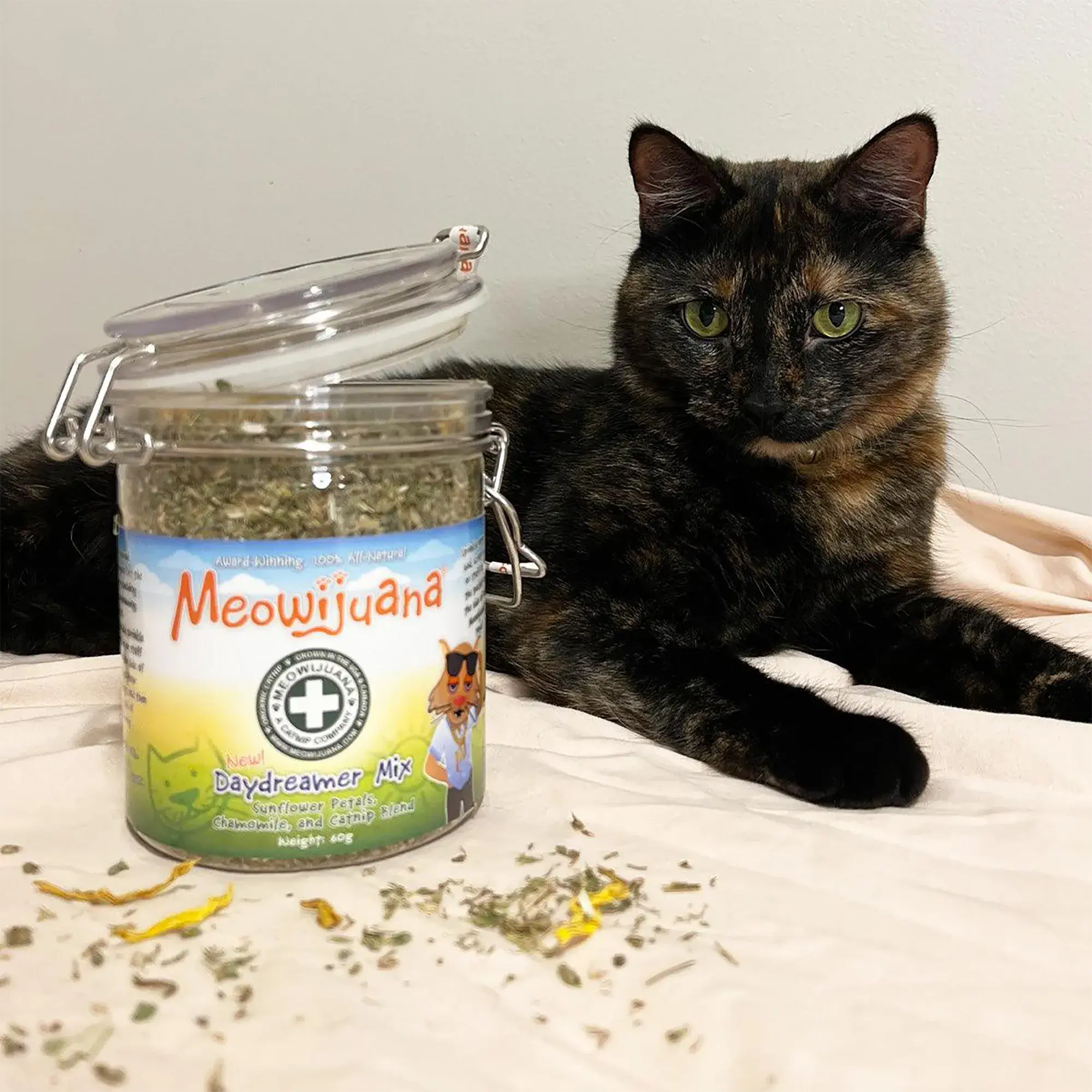 Your cat deserves a relaxing break, and the Meowijuana Daydreamer Catnip Mix is here to make it happen! Imagine your kitty spending an hour each day in a blissful daydream, rolling, purring, and lounging in pure catnip joy. Just a pinch of this atmospheric blend sprinkled on their bed, scratcher, or tucked into the side pocket of our Meowijuana toys will send your furball floating on a cloud of Meowijuana relaxation.