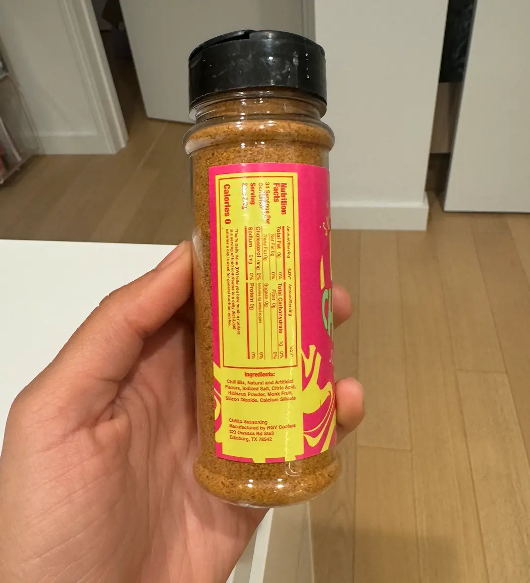 The chamoy bottle it’s smaller than expected, on the advertising images it looks bigger than the powder but in person they’re about the same size, so just imagine the chamoy bottle the size of a regular tajin bottle. For $16 I’m not sure if it’s worth it