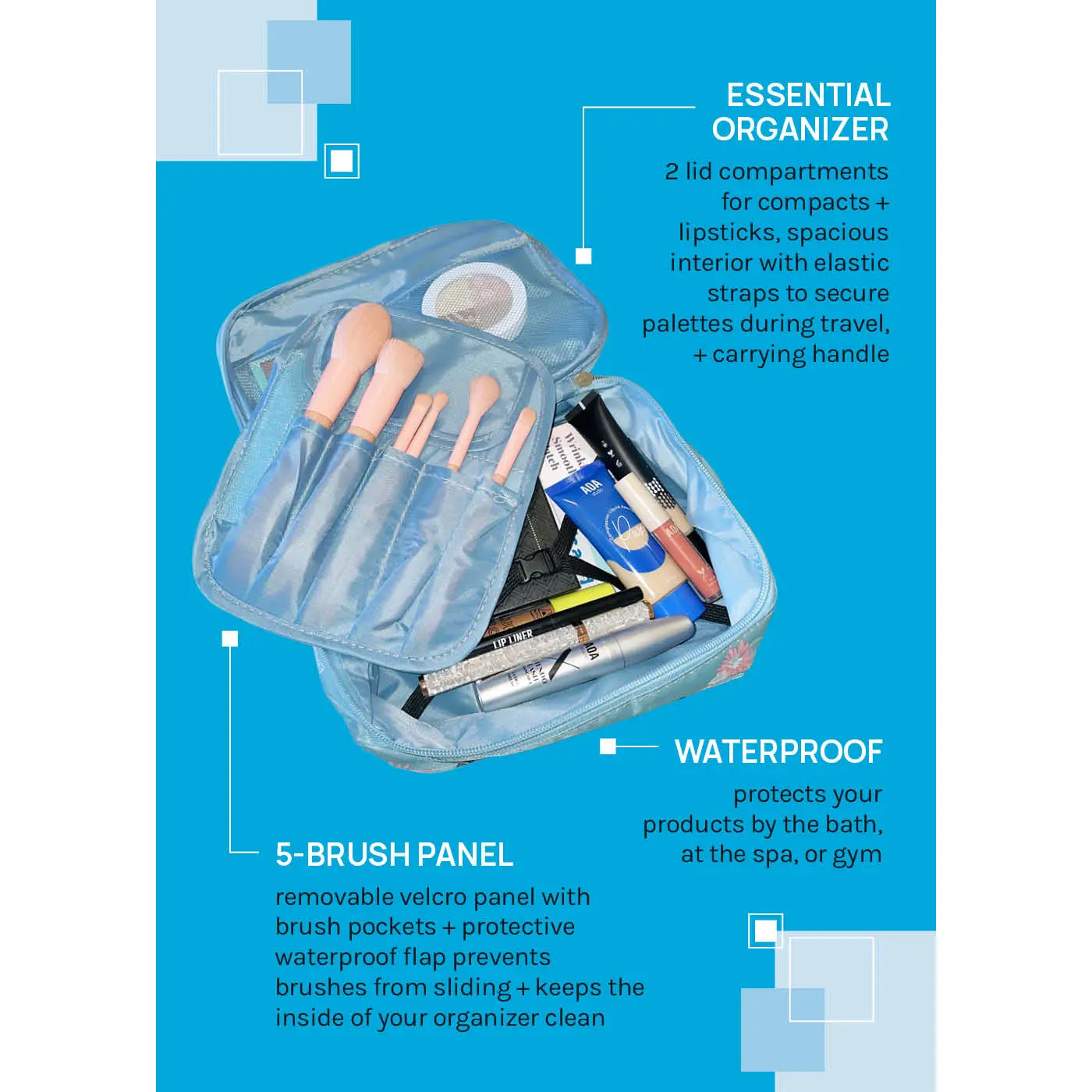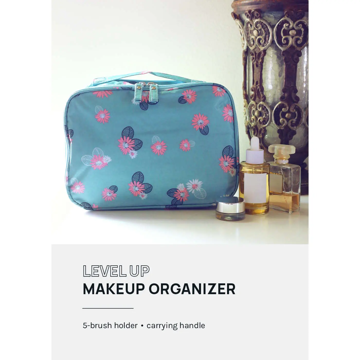 Stay effortlessly organized with this Floral Travel Vanity Case, designed for beauty lovers who need both function + flair. This chic travel makeup organizer is equipped with elastic straps to keep palettes securely in place, preventing shifting during travel. A removable velcro panel with multiple brush pockets + a protective waterproof flap ensures your brushes stay put while keeping the inside of your vanity case clean.