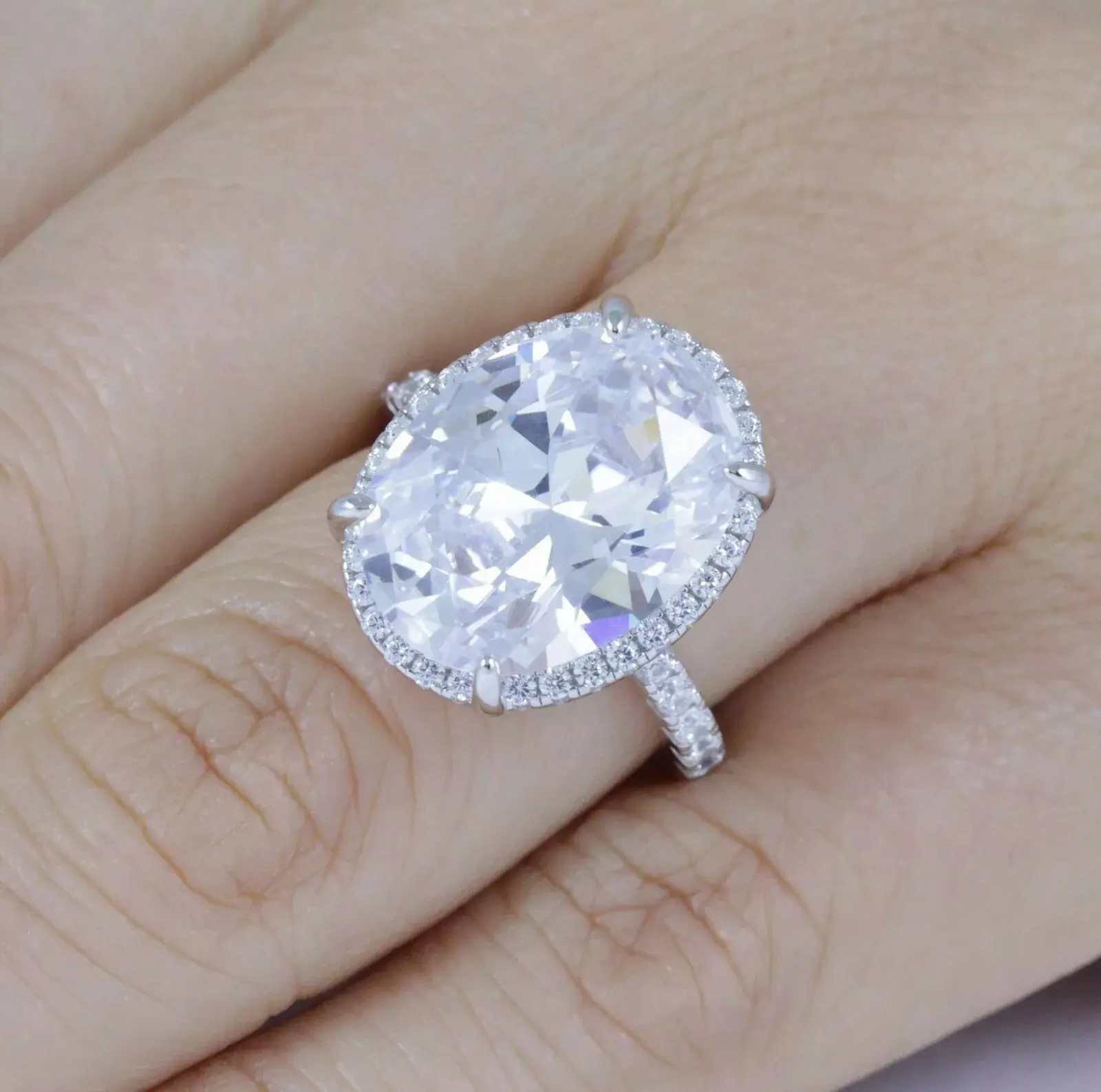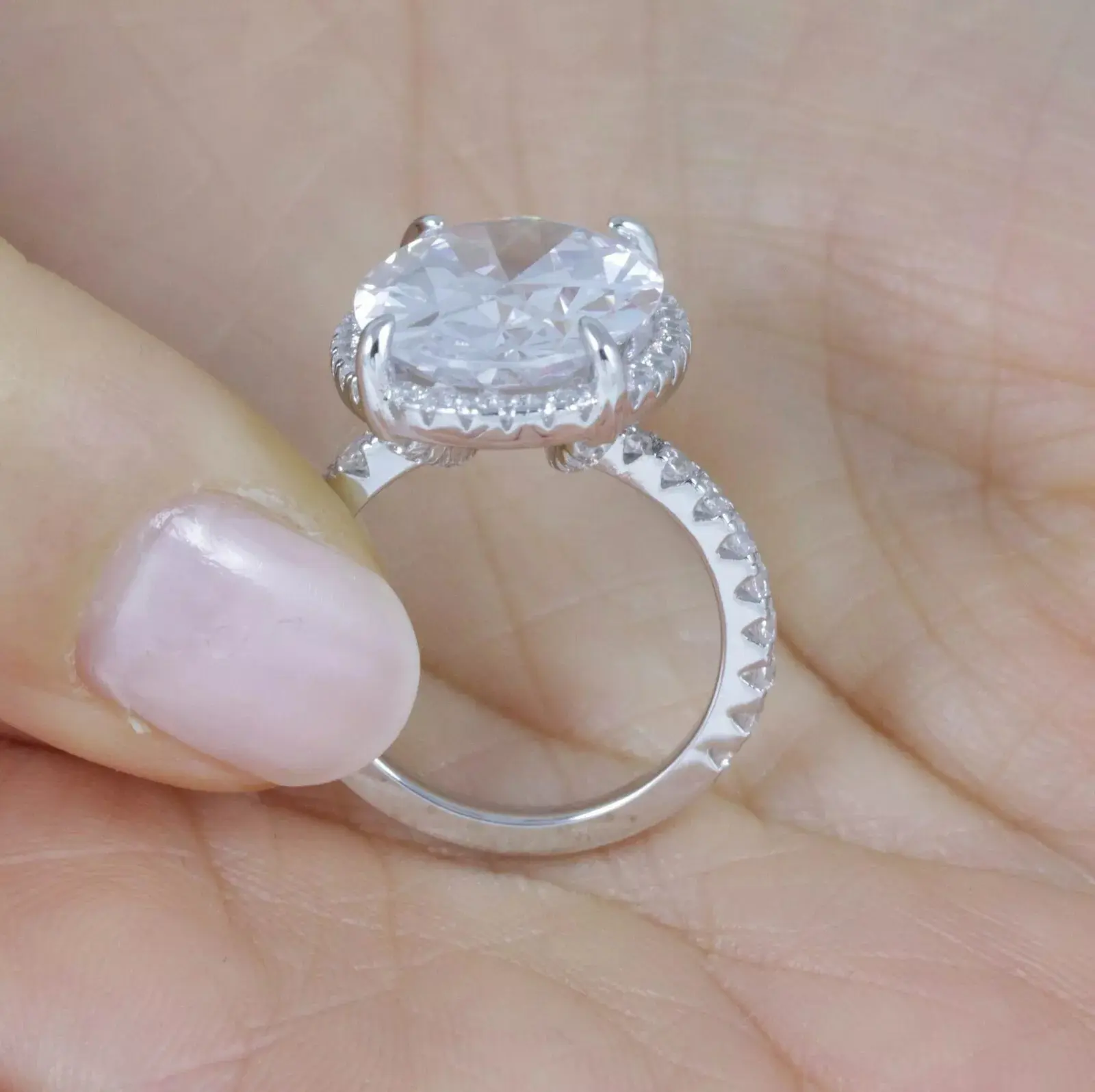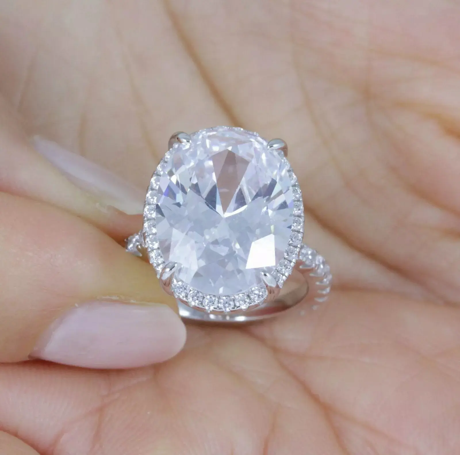 You are looking at 925 sterling silver oval cut halo Solitaire CZ engagement/fashion ring. The ring features a 16*12mm (9.32 carats) oval cut center stone, and 18pcs 1.75mm, 30pcs 1.3mm, 24pcs 1mm round cut accent stones. Top quality AAA Cubic Zirconia display amazing enriched clarity just like real diamonds! Total carat weight is approx. 10.13 carats diamond equivalent. Set in .925 sterling silver (stamped) and finished with rhodium plating for maximum shine and protection (platinum look).