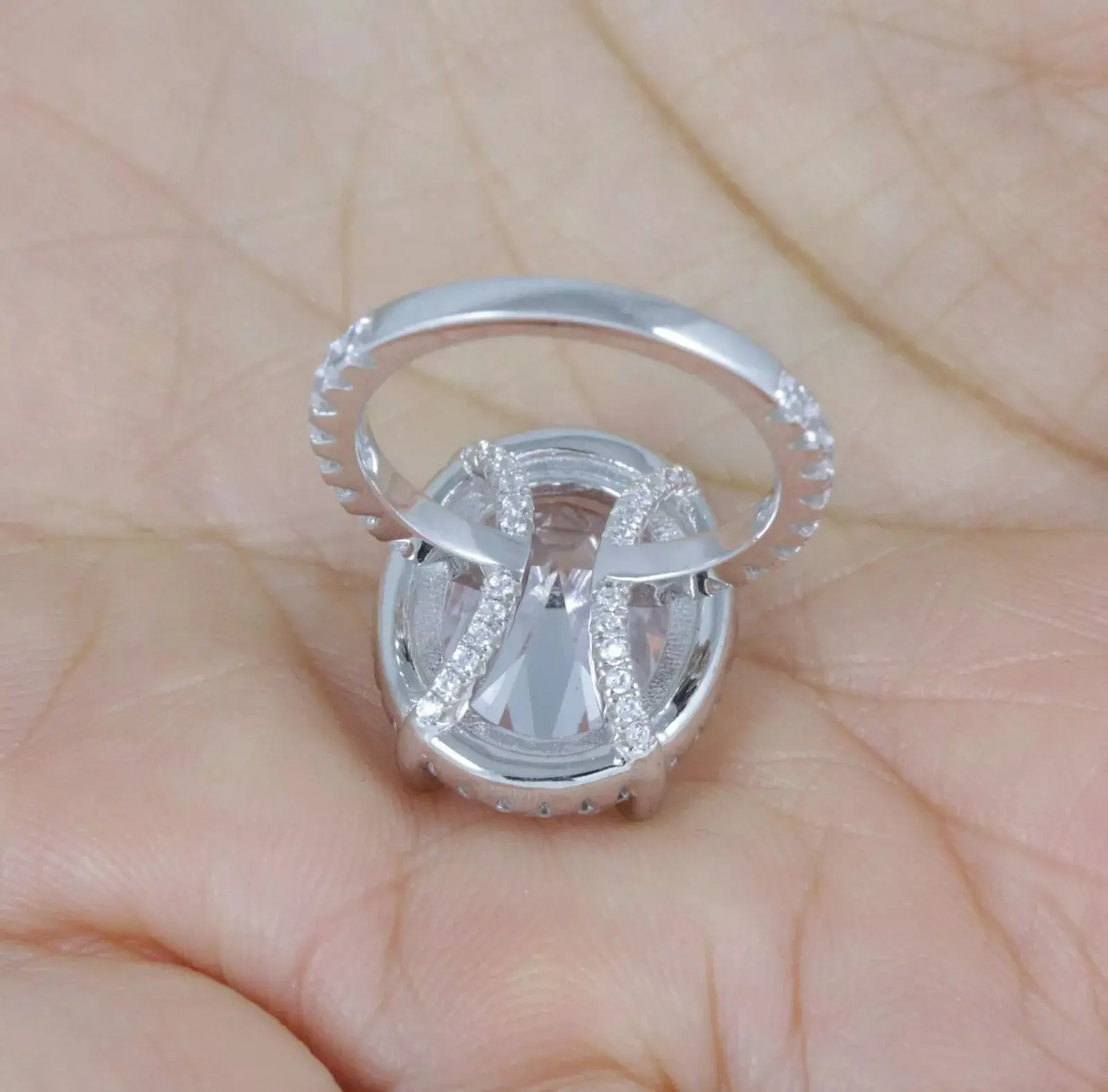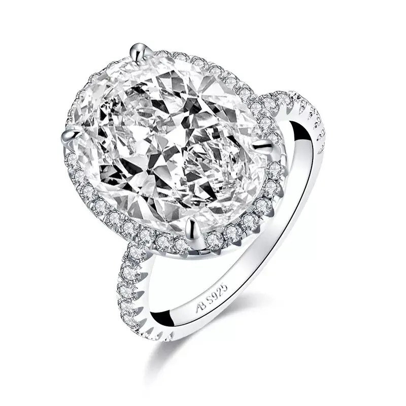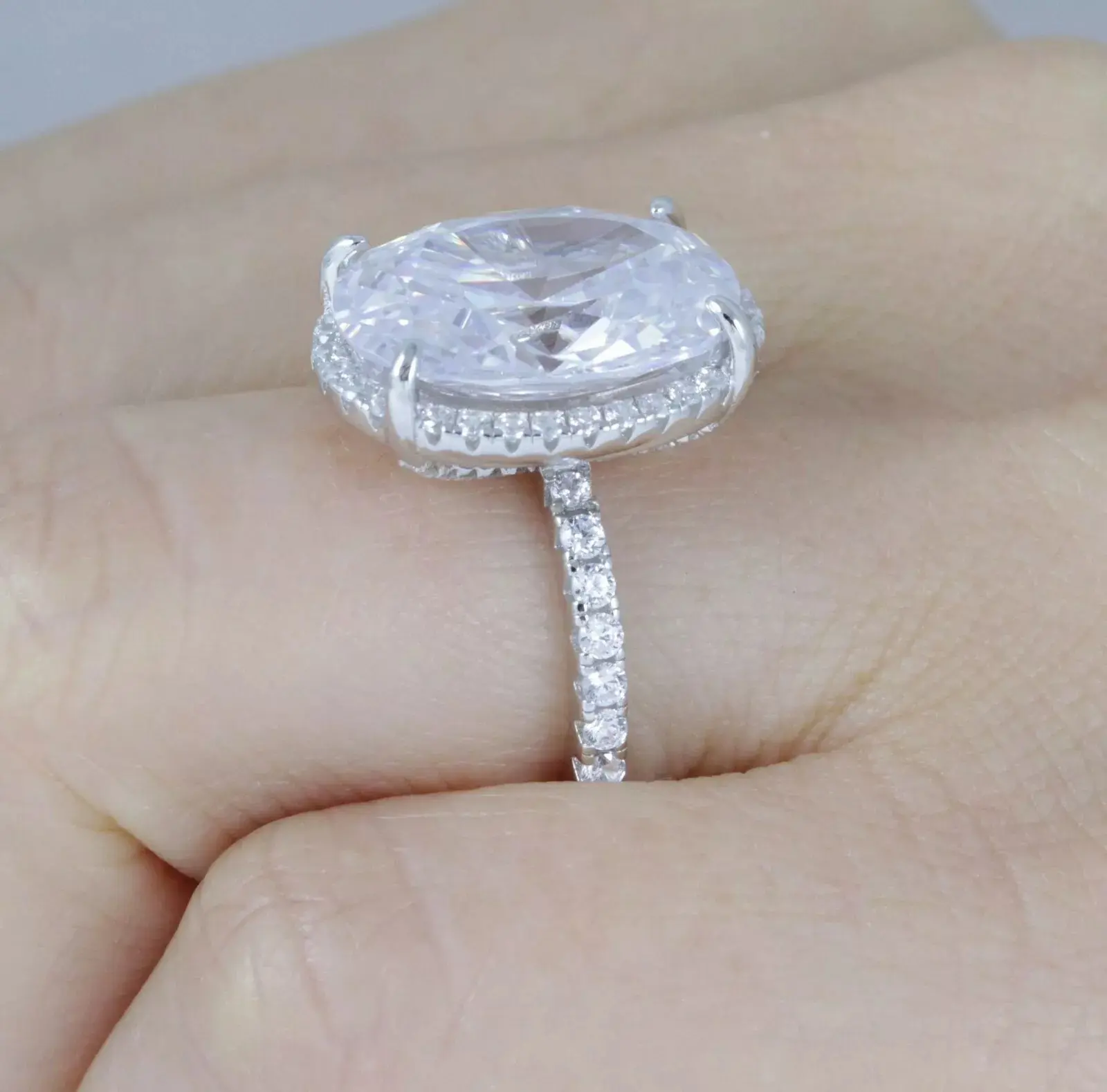 You are looking at 925 sterling silver oval cut halo Solitaire CZ engagement/fashion ring. The ring features a 16*12mm (9.32 carats) oval cut center stone, and 18pcs 1.75mm, 30pcs 1.3mm, 24pcs 1mm round cut accent stones. Top quality AAA Cubic Zirconia display amazing enriched clarity just like real diamonds! Total carat weight is approx. 10.13 carats diamond equivalent. Set in .925 sterling silver (stamped) and finished with rhodium plating for maximum shine and protection (platinum look).