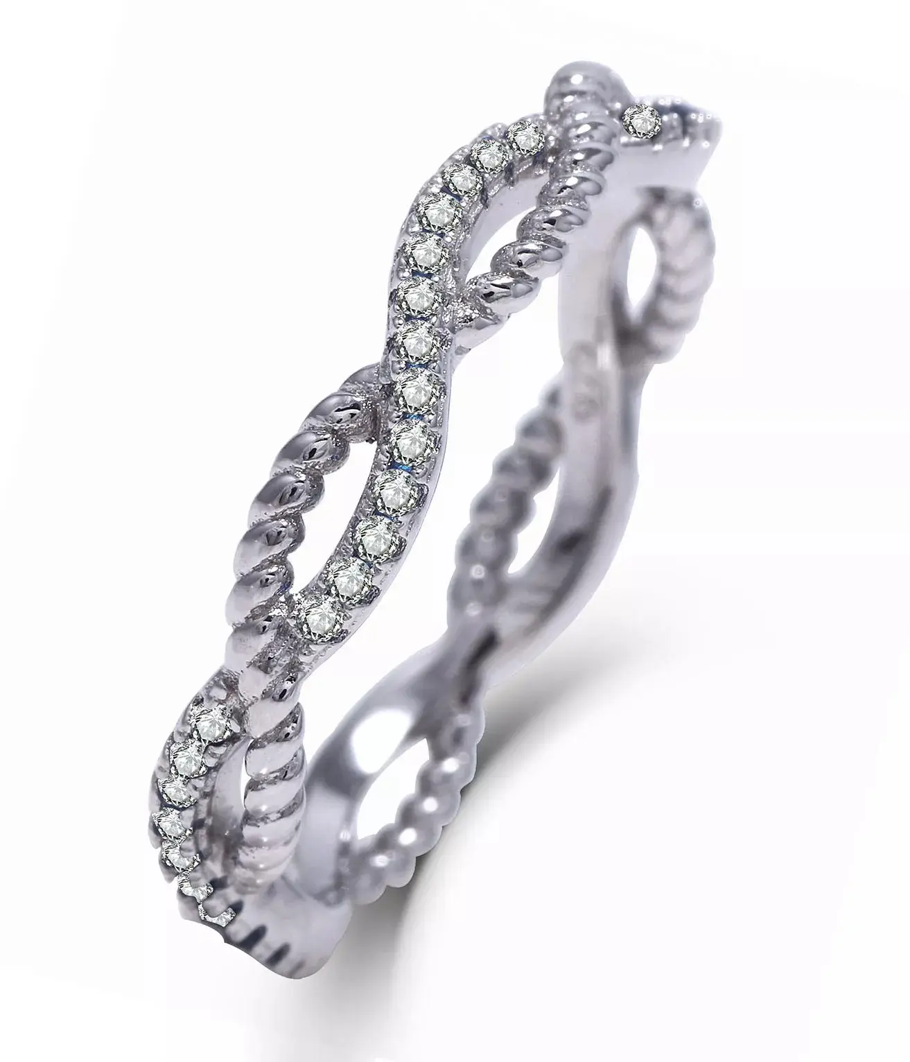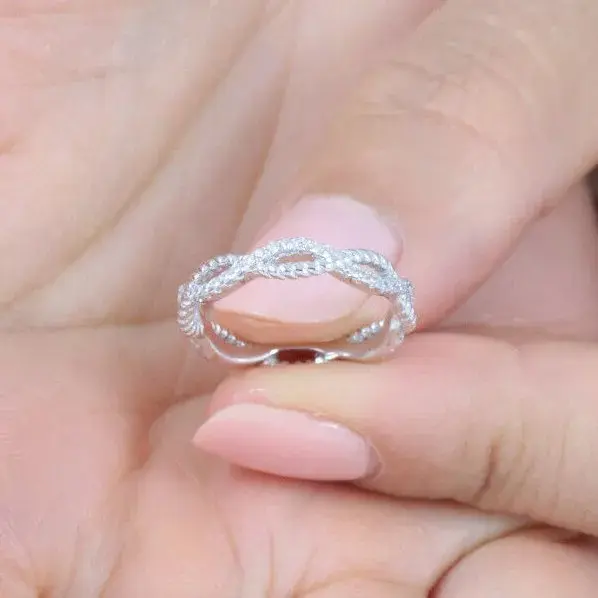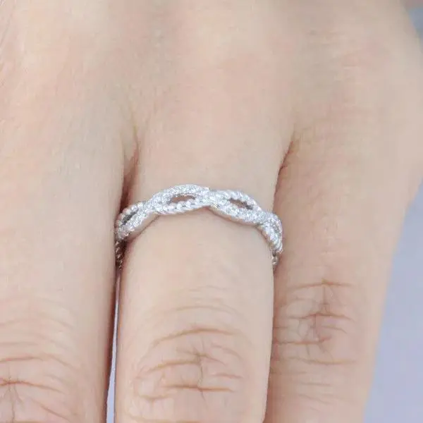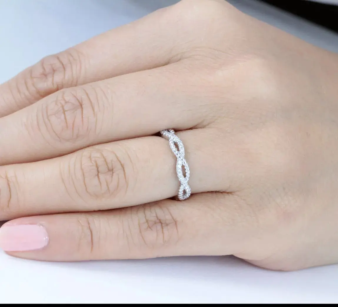 You are looking at gorgeous stack-able skinny women's CZ .925 sterling silver Infinity Love eternity wedding band /engagement/fashion ring. The ring features 1mm brilliant round cut AAA grade CZ stones around the band. Ring width is about 4mm. Top quality AAA Cubic Zirconia display amazing enriched clarity just like real diamonds! Pave set in .925 sterling silver (stamped) and finished with rhodium plating for maximum shine and protection (platinum look).