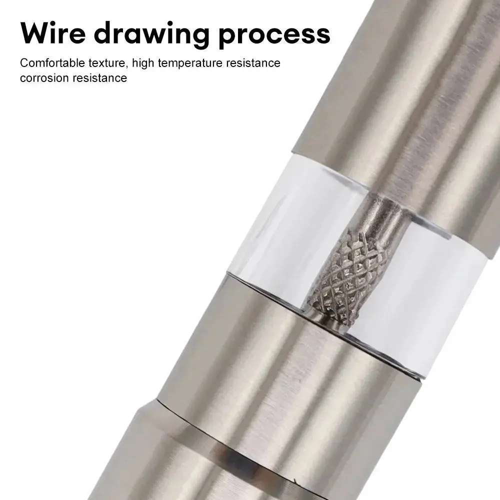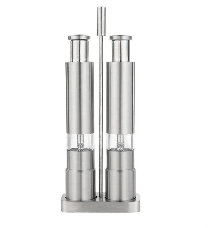 Make seasoning quick and easy. This stainless steel hand salt and pepper grinder set is designed for the convenience of everyday cooking: grinding starts with the press of a button, allowing you to use it with one hand. The transparent window helps you see how much is left and avoid mixing up your spices, while the stand keeps your table tidy and looks beautiful when served.