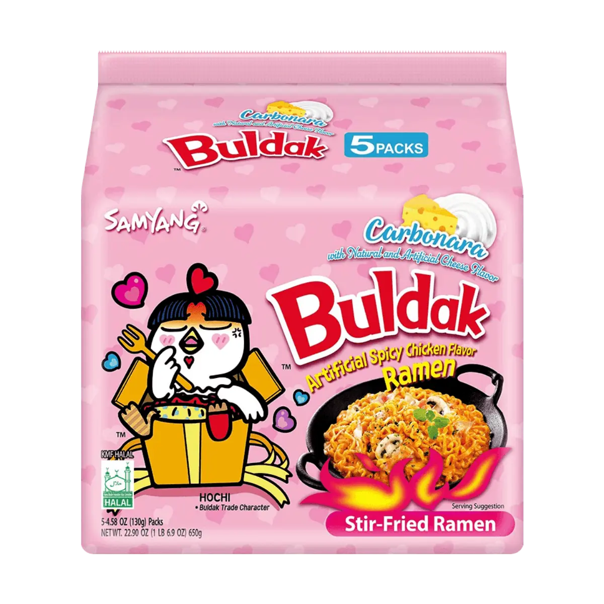 Experience a unique fusion of Korean and Italian flavors with Korean Carbonara Stir-Fried Ramen. This spicy stir-fried ramen noodle pack features an Italian Carbonara flavor, a variation of Samyang's bestselling Hot Chicken Ramen. Quick and easy to make, each pack is ready in just 5 minutes.