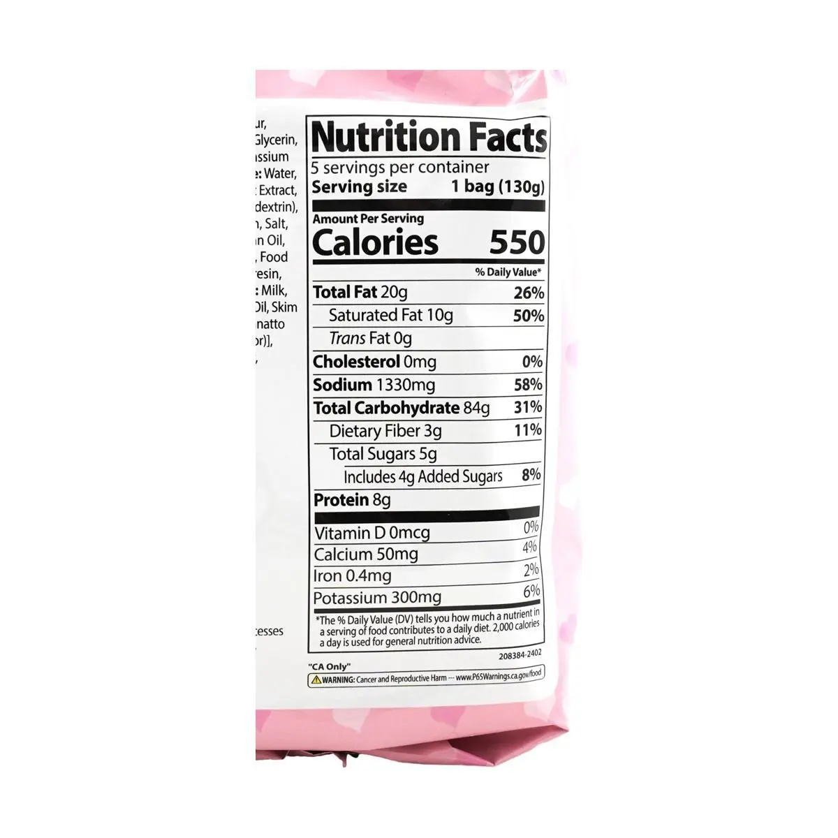 Noodles 77.5%: Wheat Flour, Modified Tapioca Starch, Refined Palm Oil, Modified Potato Starch, Refined Salt, Glycerin, Soybean Oil, Thickener (Guar Gum E412), Purified Water, Emulsifier ( Lecithin E322), Acidity Regulator( Potassium Carbonate Anhydrous E501, Sodium Carbonate E500, Sodium Phosphate Dibasic E339, Citric Acid E330), Green Tea Flavour Oil Soup 12.7%: Whole Milk Powder, White Sugar, Milk Powder, Salt, Mozzarella Cheese Powder, Butter Powder, Modified Potato Starch, Parsley Curly, Pepper Powder, Garlic Powder, Soybean Oil Flake 9.8%: Water, Soy Sauce, White Sugar, Artificial Chicken Flavour Powder, Artificial Chicken Flavour, Red Pepper Powder, Chilli Pepper Powder, Soybean Oil, Onion, Red Pepper Seed Oil, Garlic, Modified Potato Starch, Paprika Extract, Decolorized Chilli Extract, Black Pepper Powder, Curry Powder