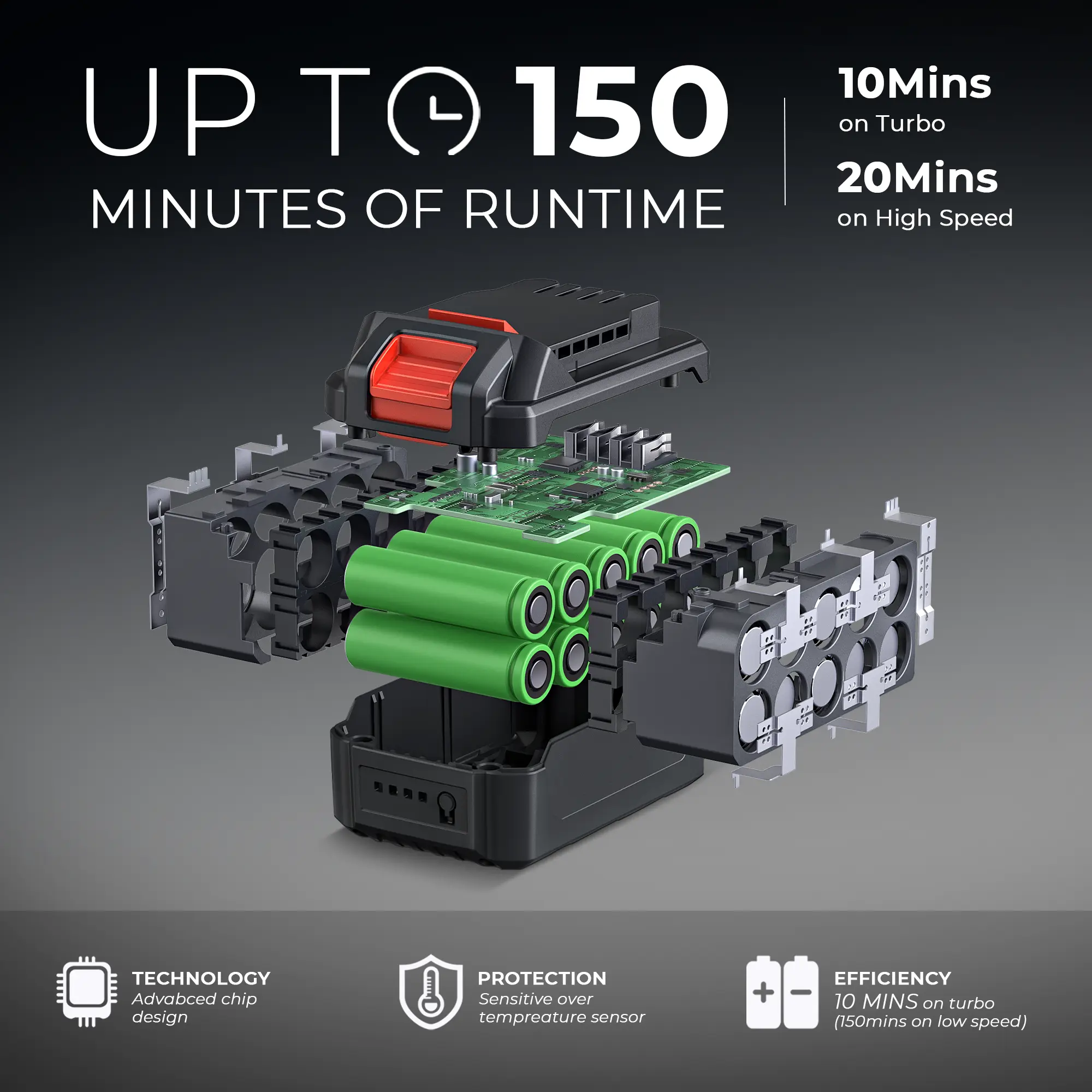 ·【150Min Runtime & 1 Hour Fast-Charging】With its long-lasting rechargeable battery, you can enjoy uninterrupted operation for up to 150Min(on low speed) and 10Min(on turbo) on a single 1 hour fast charging, making it perfect for large outdoor spaces and heavy-duty cleaning tasks.