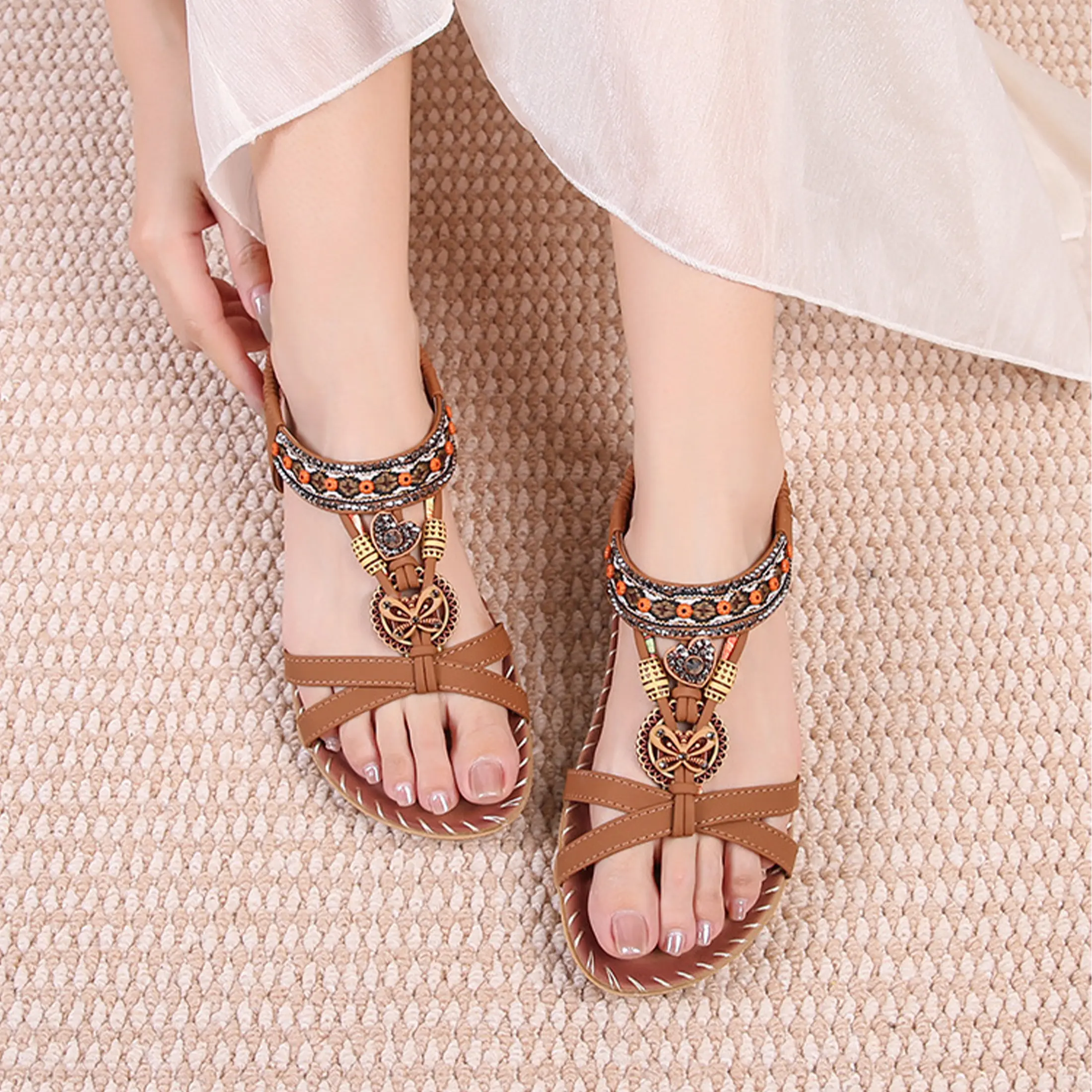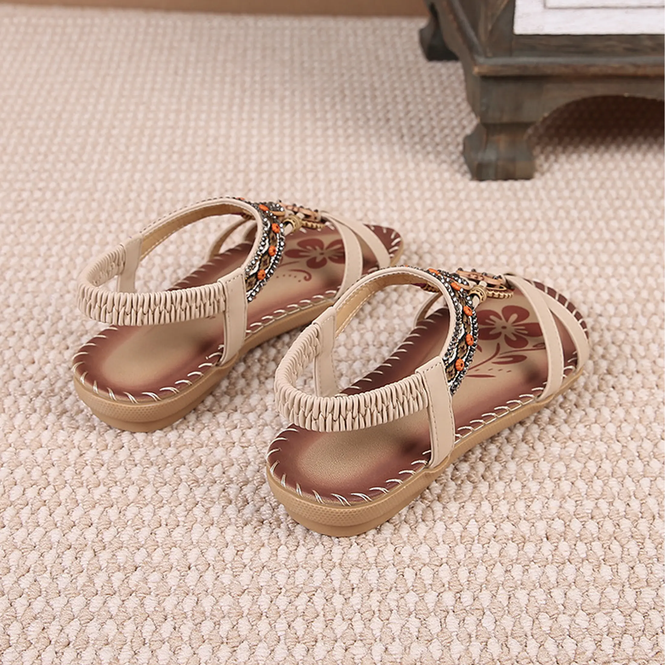 "👡BOHEMIAN DESIGN: Flats sandals for women feature light luxury rhinestones and artificial gemstone ornaments.Sandals women are more comfortable and charming with low heel flat design.