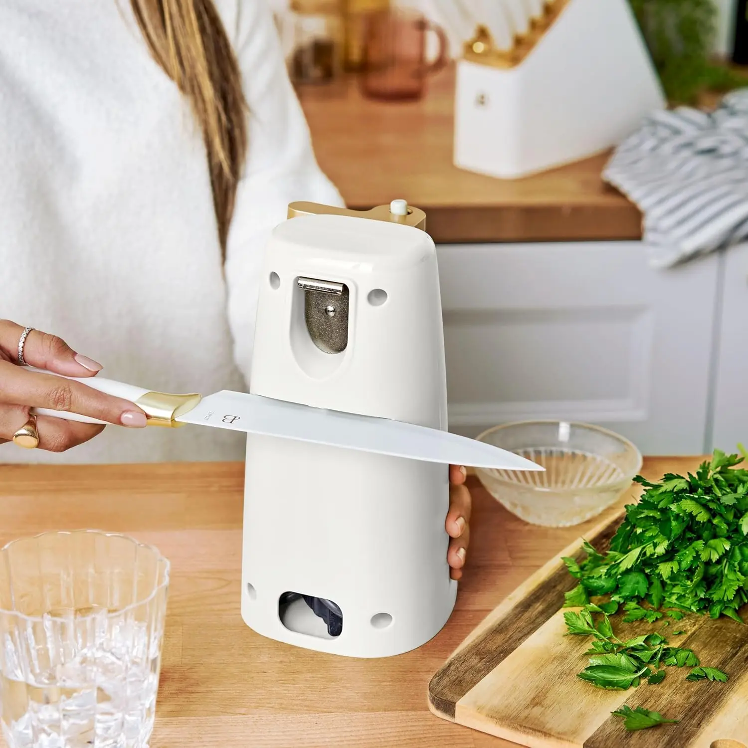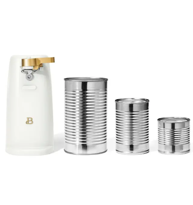 Streamline your mealtime prep with the Beautiful Easy-Prep Electric Can Opener. A stainless steel cutting blade and magnetic lid holder combine to open small, standard and tall cans with ease. This handy can opener also includes an auto-turn feature for convenient one-touch operation and a removable lever for easy cleaning, helping you get to your cooking tasks faster. It’s innovative no-tilt design keeps it steady too, for a worry-free prep. Plus, it also includes a built-in knife sharpener and bottle opener making it a true workhouse in your kitchen. A convenient cord storage compartment makes it easy to tuck away when not in use. Available in White Icing with signature gold accents. Exclusively at Walmart. Condition: new.