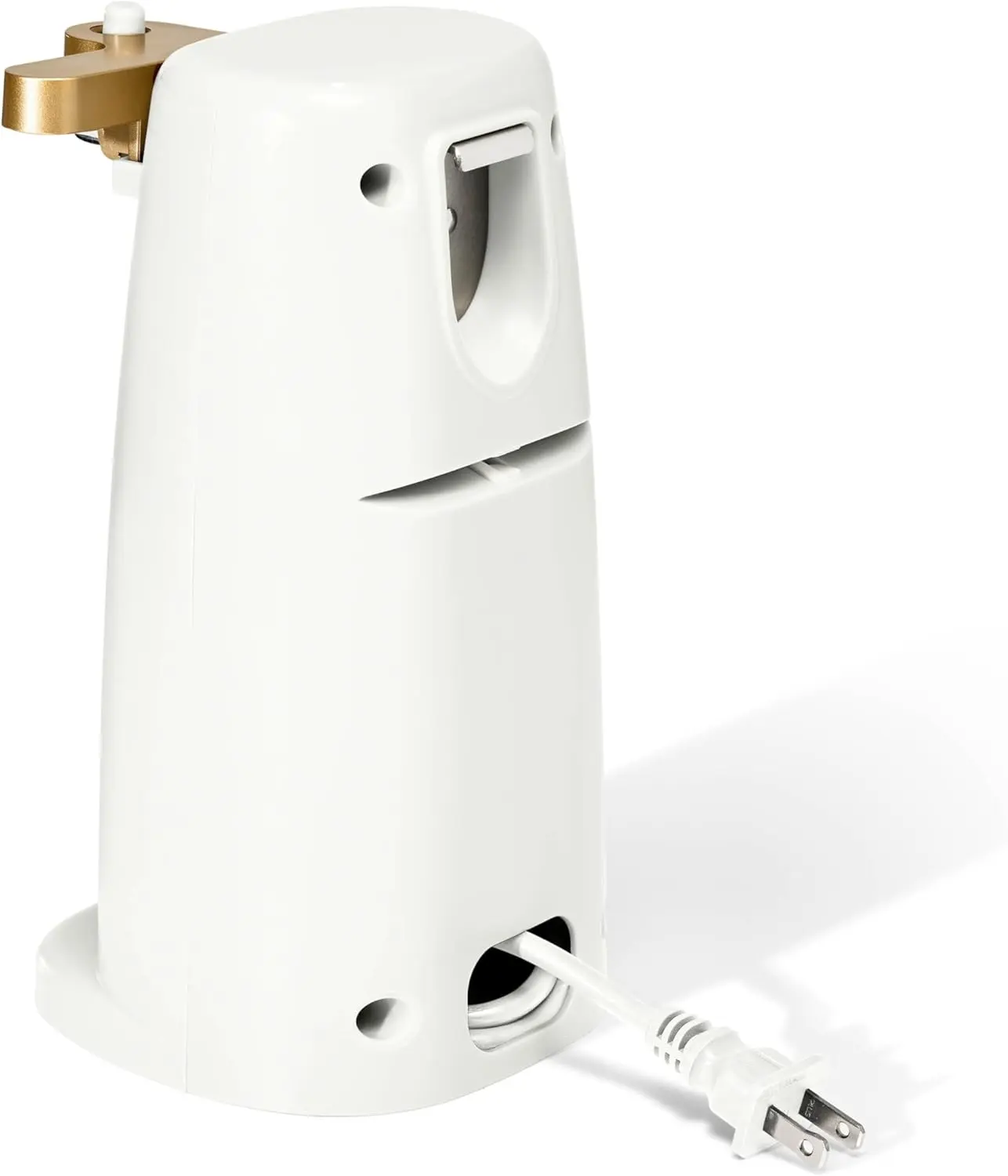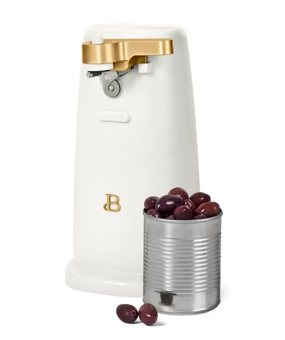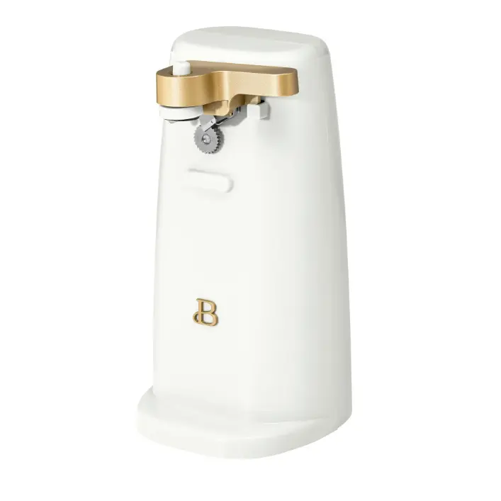 Streamline your mealtime prep with the Beautiful Easy-Prep Electric Can Opener. A stainless steel cutting blade and magnetic lid holder combine to open small, standard and tall cans with ease. This handy can opener also includes an auto-turn feature for convenient one-touch operation and a removable lever for easy cleaning, helping you get to your cooking tasks faster. It’s innovative no-tilt design keeps it steady too, for a worry-free prep. Plus, it also includes a built-in knife sharpener and bottle opener making it a true workhouse in your kitchen. A convenient cord storage compartment makes it easy to tuck away when not in use. Available in White Icing with signature gold accents. Exclusively at Walmart. Condition: new.