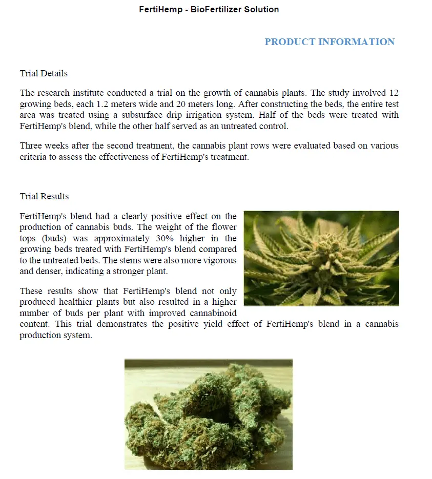 In growing beds treated with Fertihemp, flower bud weight was approximately 30% higher compared to untreated beds — achieved without increasing fertilizer strength.