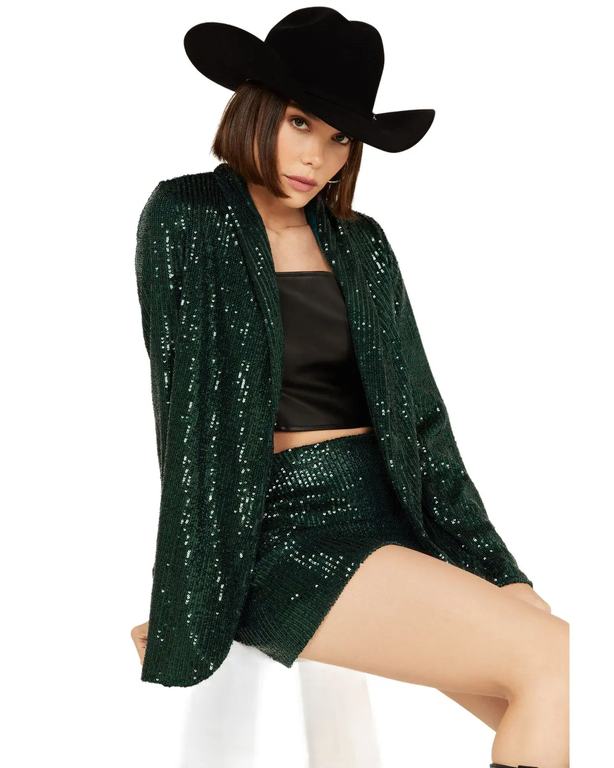 Sequins: 95% polyester / 5% elastane ; Lining: 100% polyester. Shawl collar. Open front styling. Long sleeves. Solid dark green sequins design. Lined. Hand wash cold. Made in the USA with globally sourced materials. Model is 5' 10" wearing a size small.