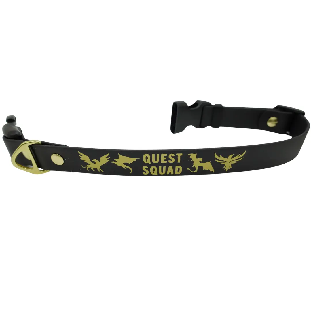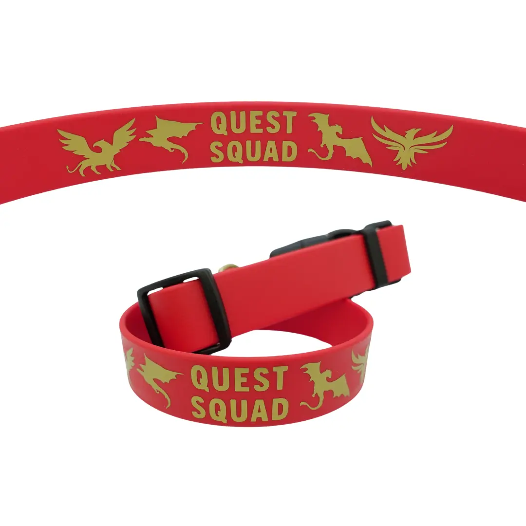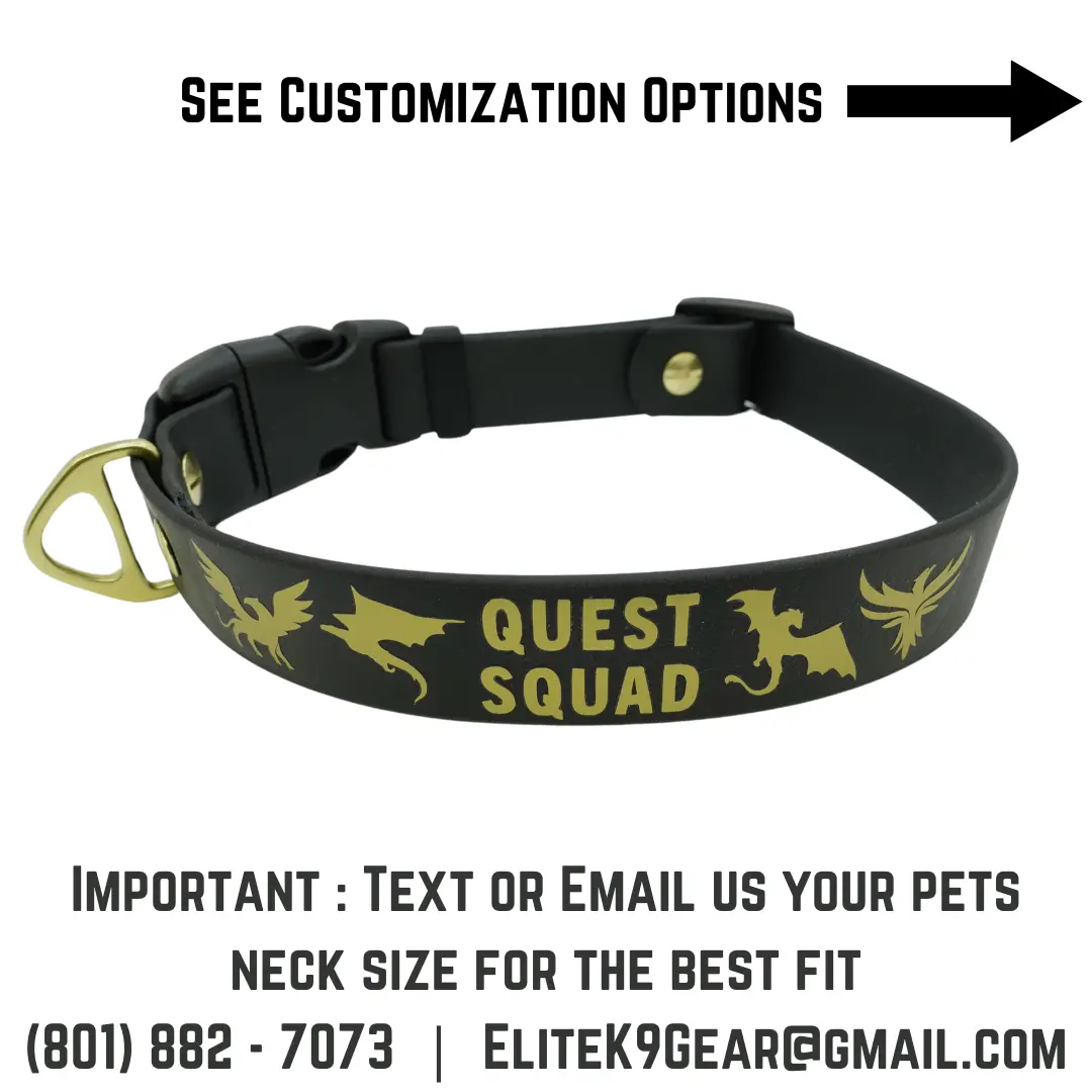 This Special Edition Collar comes with the message "QUEST SQUAD" and four dragon graphics as show in the product photos. *If your dogs neck size is smaller than 14 inches there will be less dragon graphics since they won't all fit. :)