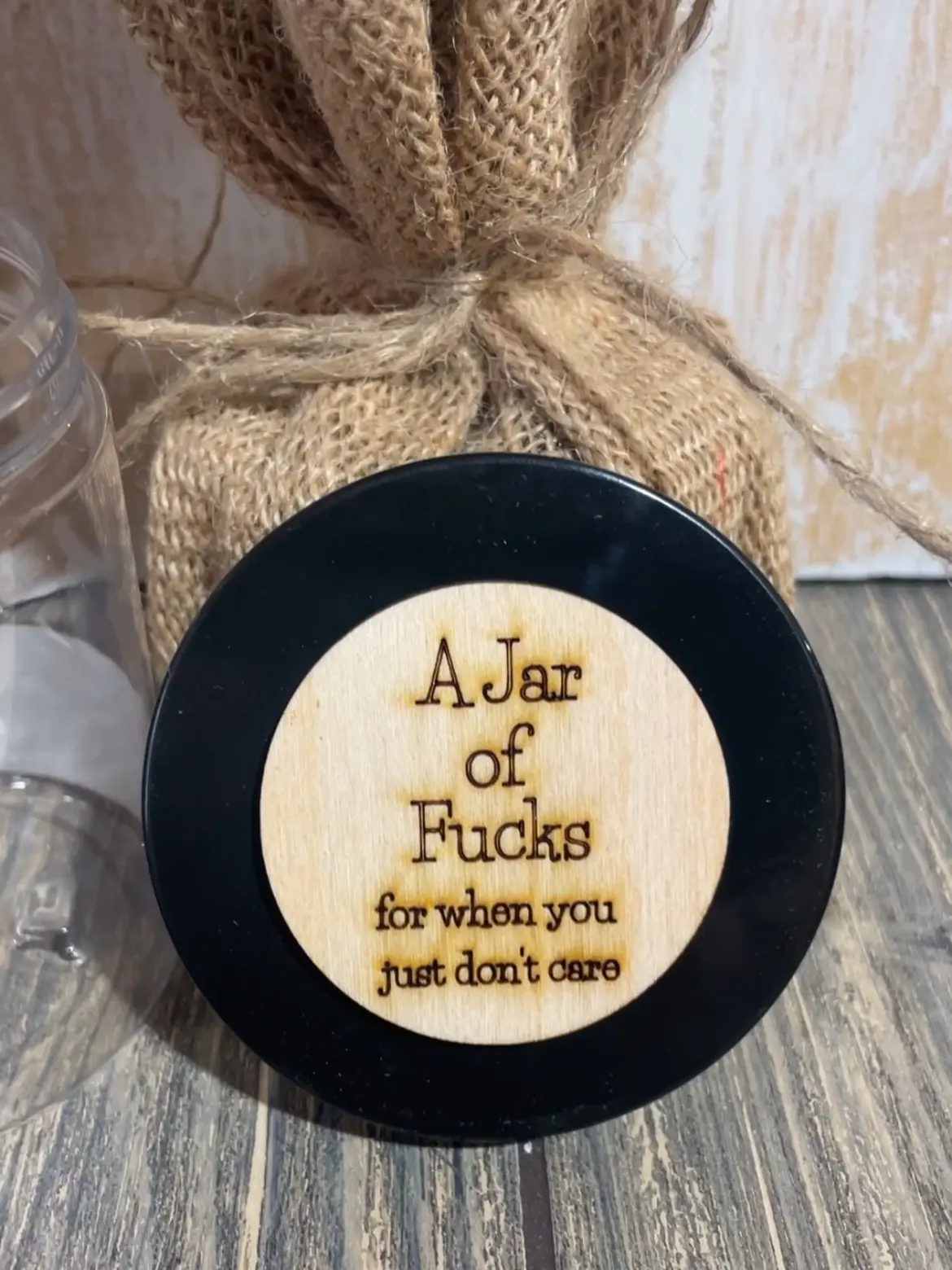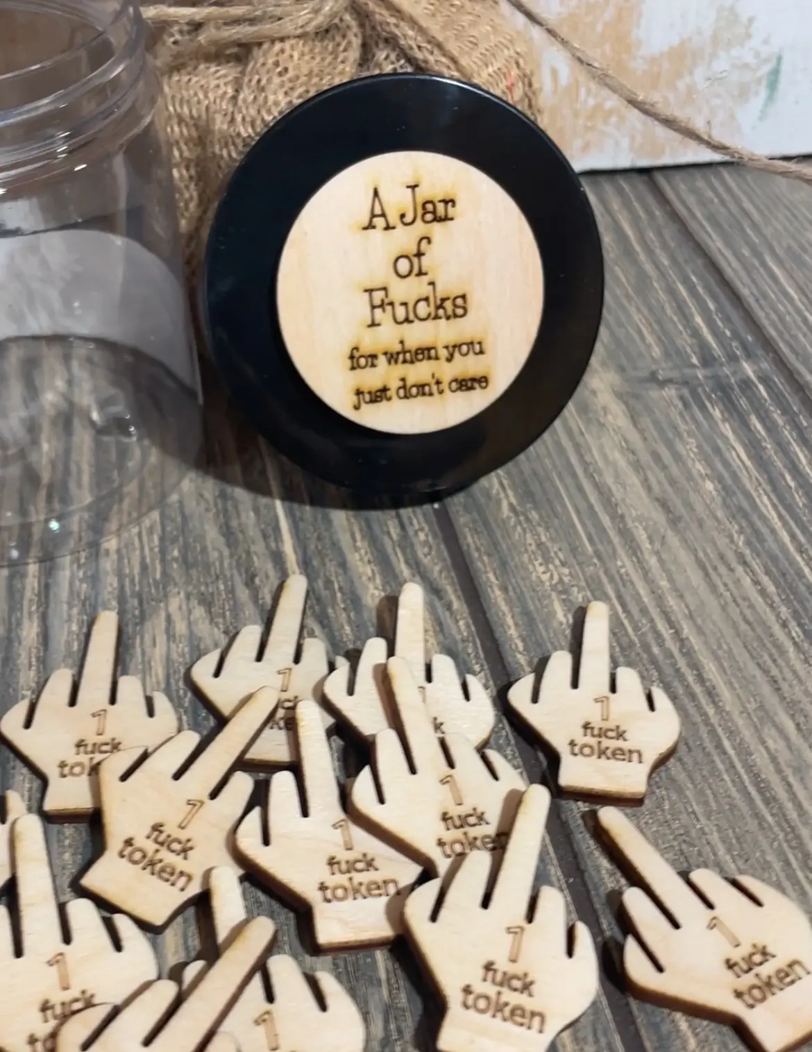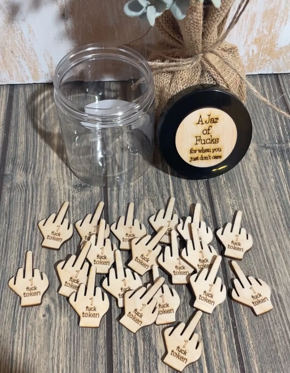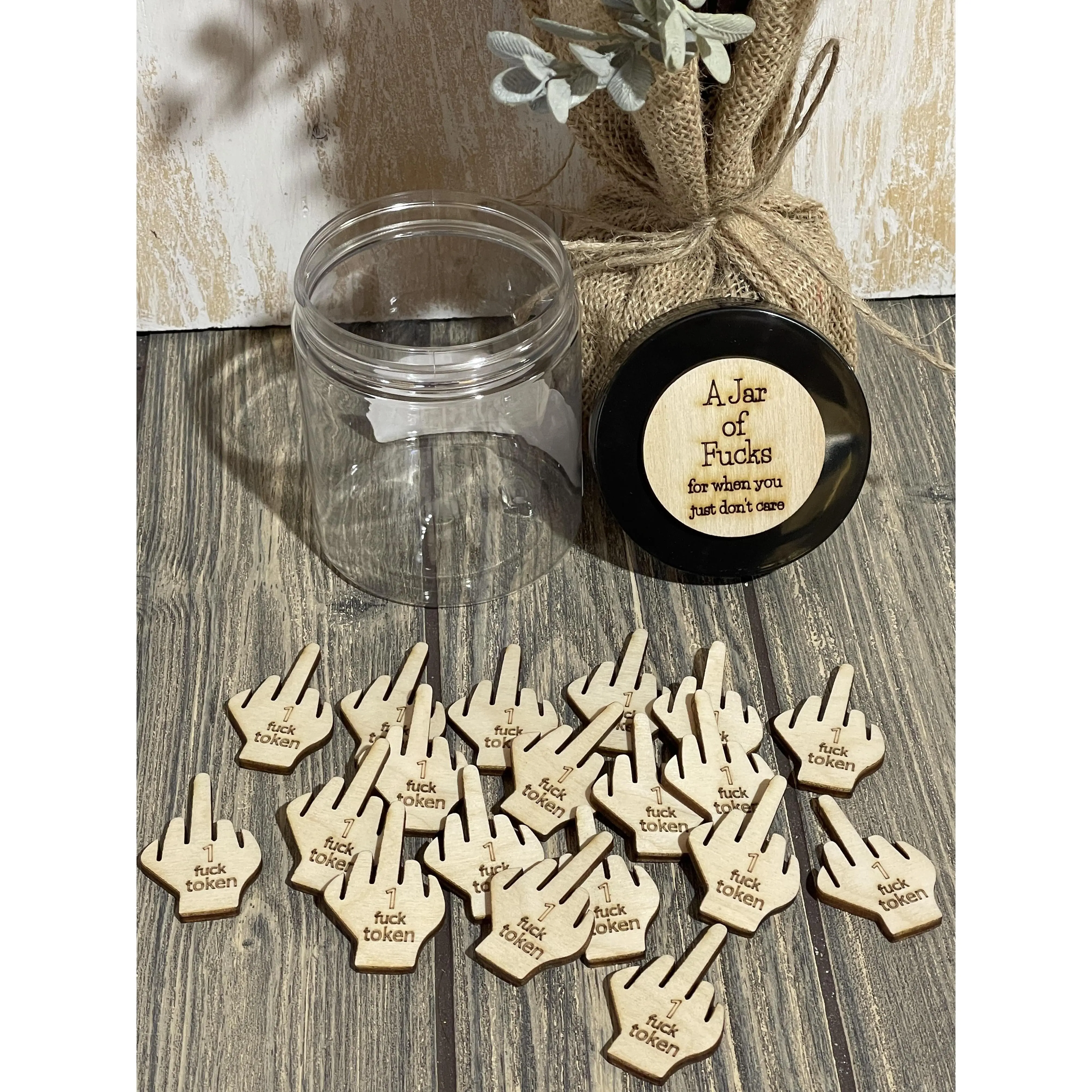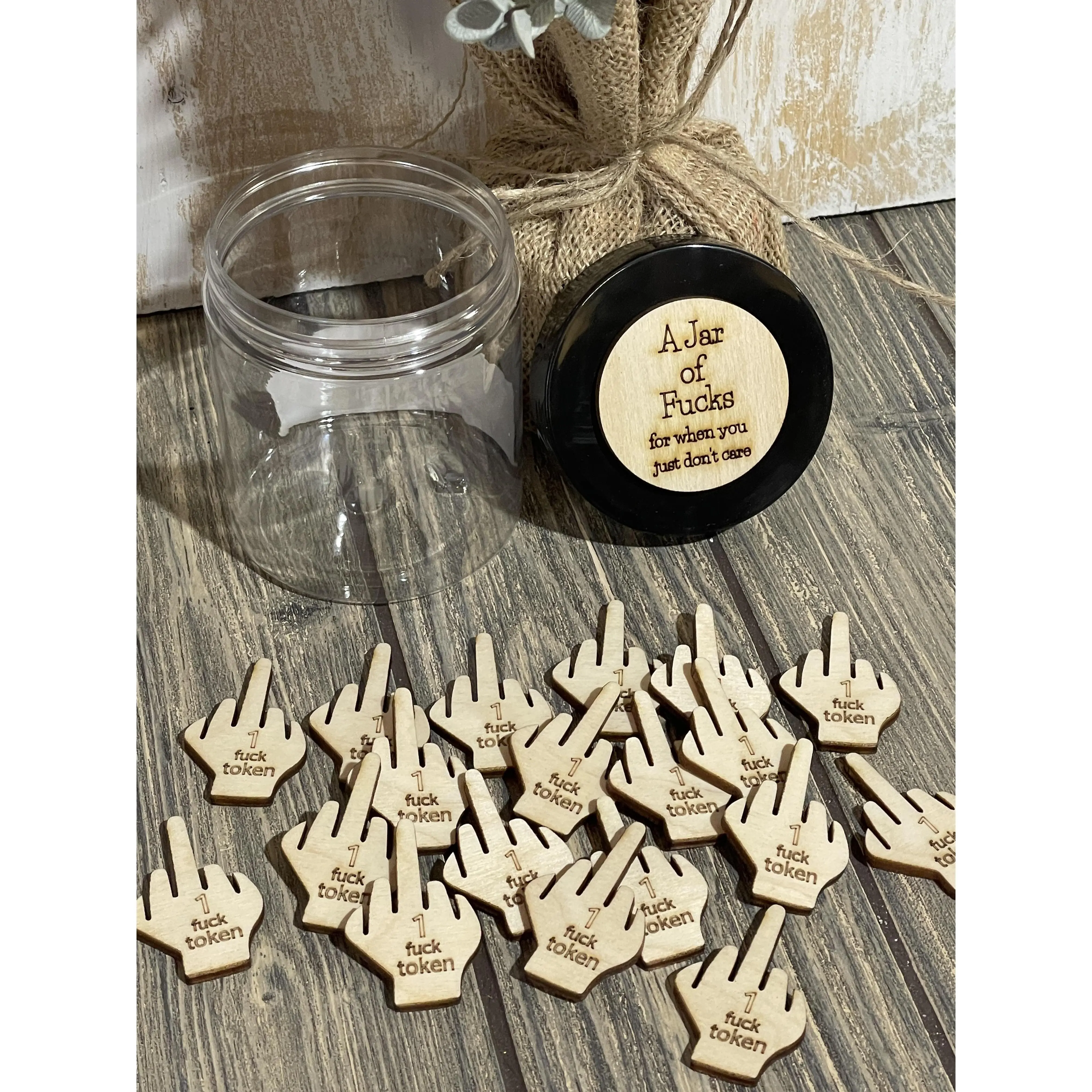 Finally, a jar full of f***s—because sometimes, you just don't care! This 8 oz plastic jar with a secure lid holds 16 laser-cut and engraved middle finger tokens, each crafted from premium Baltic birch wood. Perfectly sassy and hilariously practical, this jar is your go-to for handling life's "I can't even" moments. Each Plastic Jar comes with 18 Middle finger tokens.