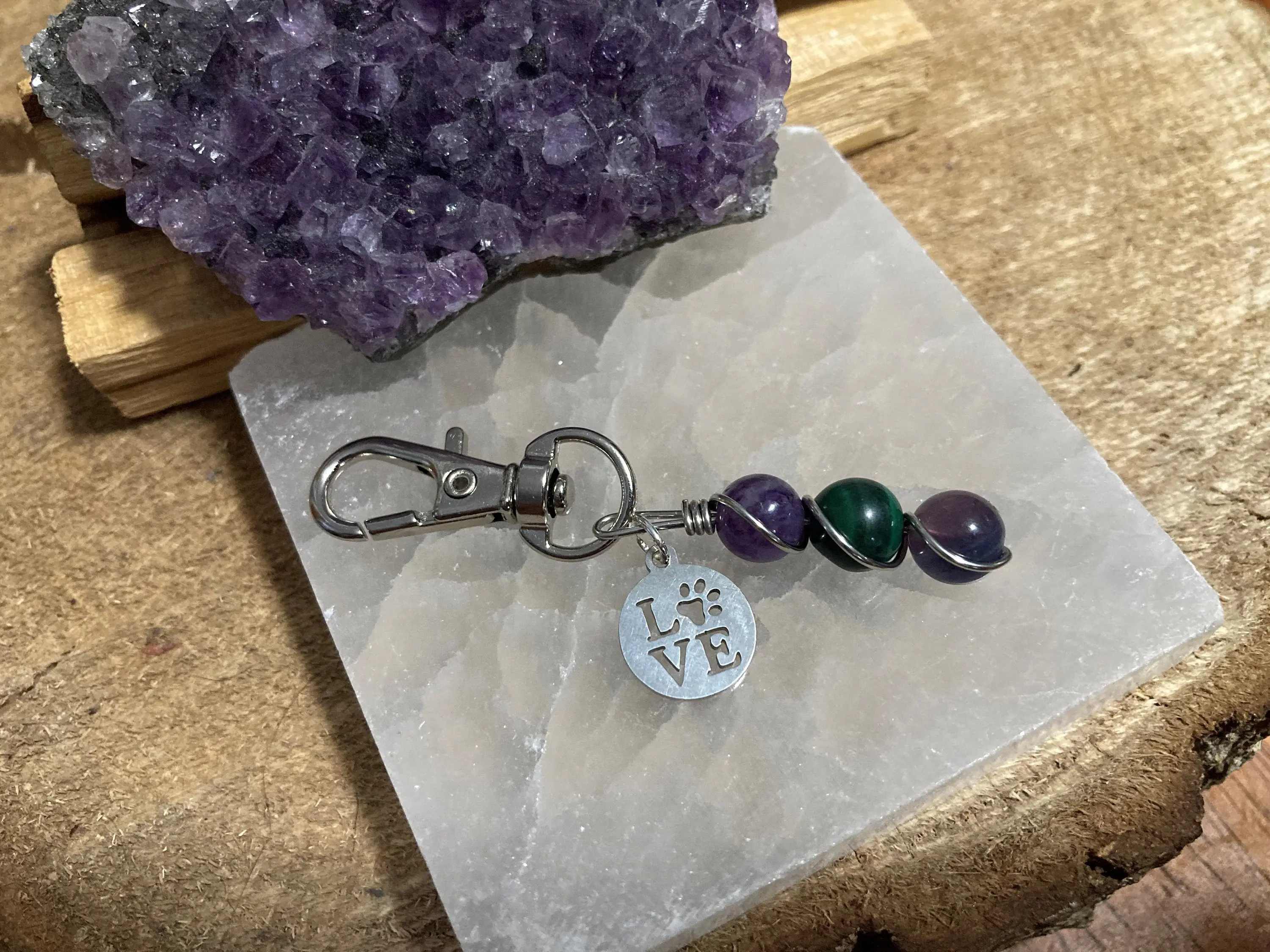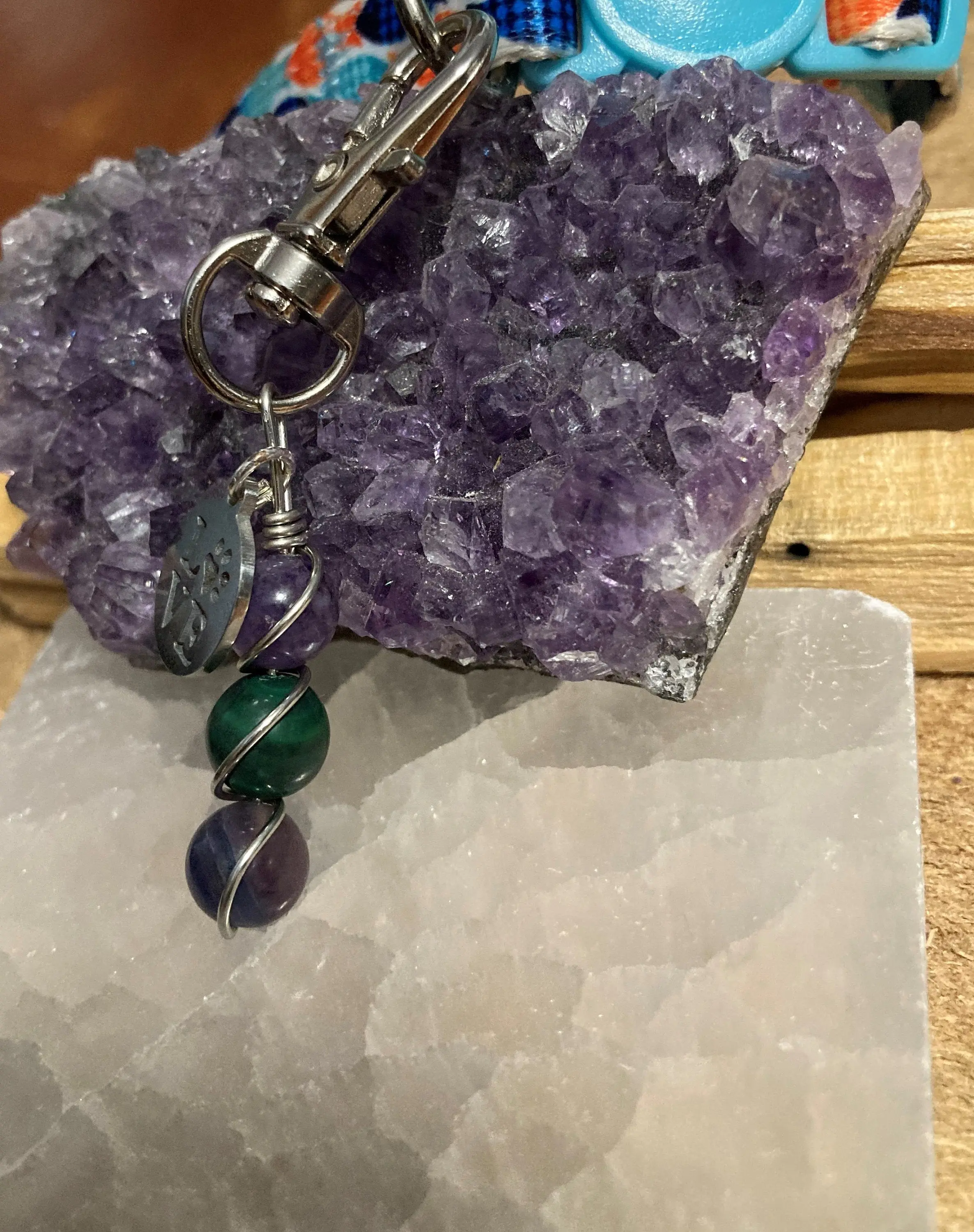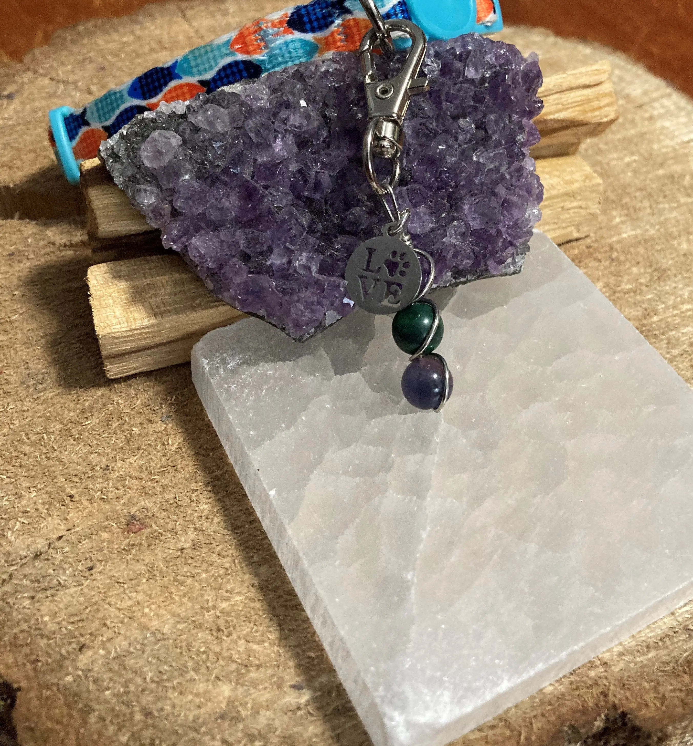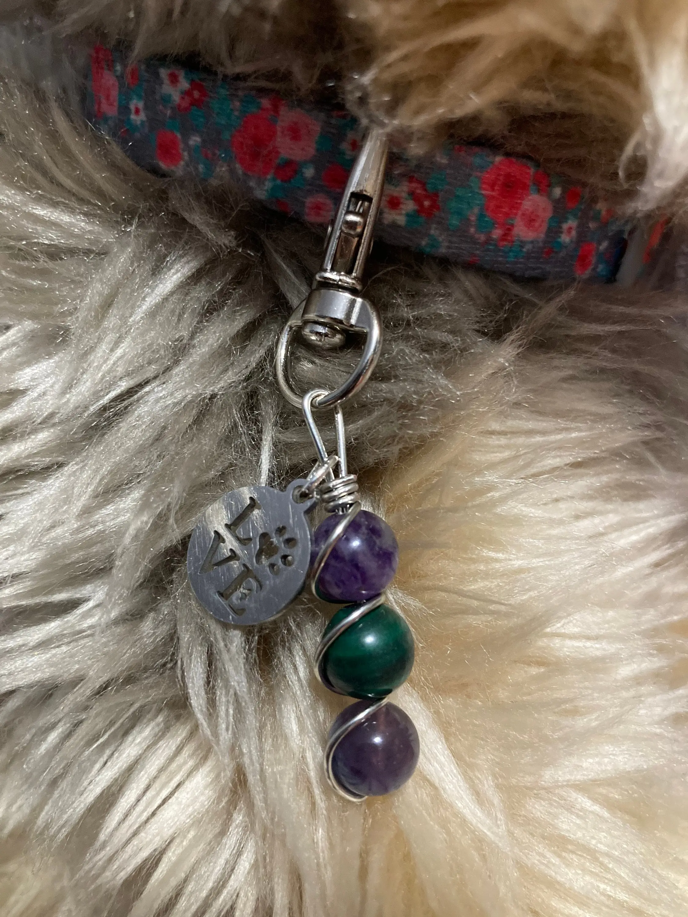 This pet collar charm is a vibrant and meaningful accessory, crafted with Malachite and Fluorite to bring healing and protection to your furry friend. Malachite, with its rich green swirls, is known for its transformative energy, promoting growth and emotional balance. Fluorite, with its calming array of colors, enhances mental clarity and protection, helping to clear negative energy and bring peace. Together, these stones create a powerful combination that supports your pet’s well-being, both emotionally and energetically. With their soothing and protective qualities, this charm is a perfect way to add a touch of natural beauty to your pet’s collar while providing them with a little extra care and positive energy in their everyday adventures.