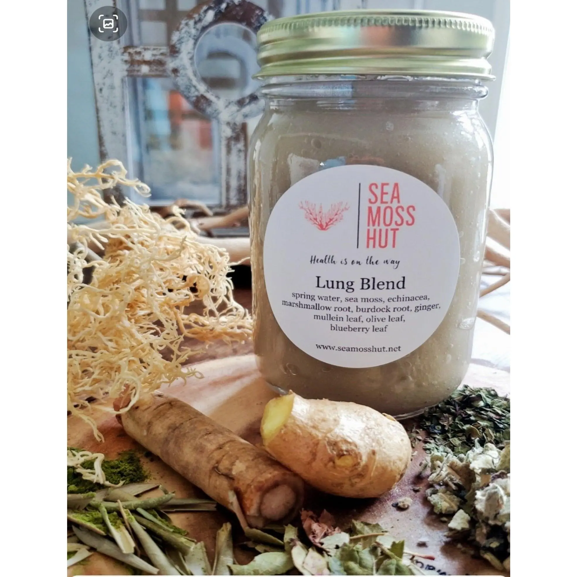 Ingredients: spring water, wildcraft sea moss, marshmallow root, echinacea, olive leaf, blueberry leaf, mullein leaf, and burdock root, sarsaparilla roots, ginger root, soursop leaf, ginger