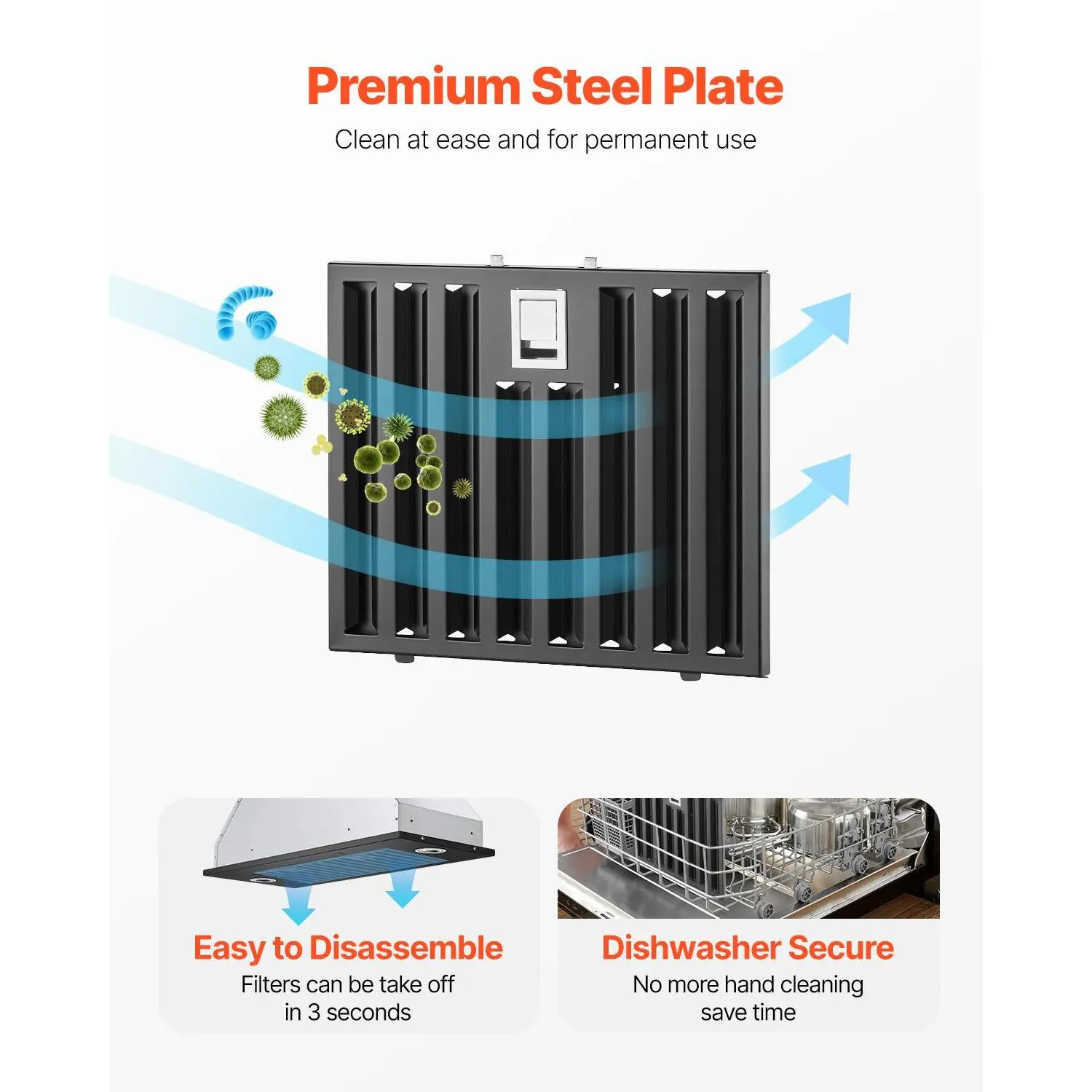 • Premium Steel Plate: Crafted for durability and ease of maintenance, the vent hood features steel plate. Its 2 detachable filters effectively capture grease and oil, making cleanup a breeze.