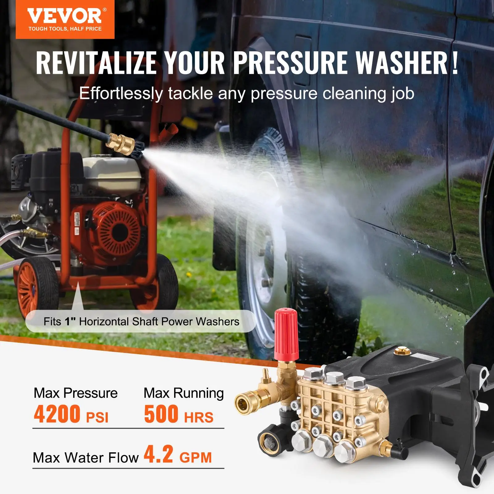 • High-Efficiency Cleaning Power: Our pressure washer pump delivers up to 4200 PSI of powerful water pressure with a maximum flow rate of 4.2 GPM, ensuring fast completion of tasks ranging from household cleaning to light industrial jobs. (Recommended working pressure: 3400 PSI for typical residential and light industrial cleaning and to extend pump life.)
