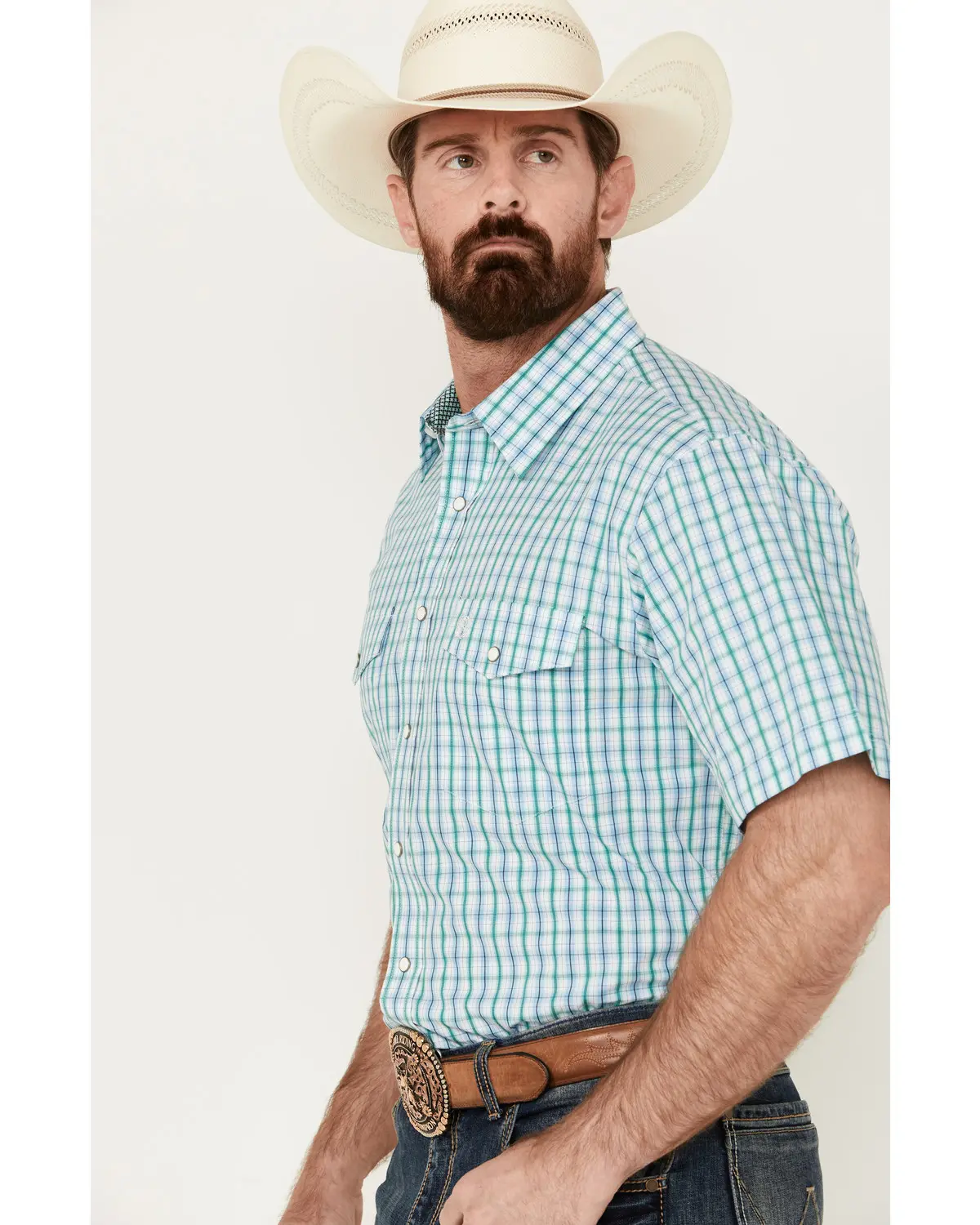 Model is 6'3" wearing a size large. Spread collar. Short sleeves. Pearl snap placket and pockets. Two single-point chest flap pockets with pearl snap closures. Western yoke on back. Logo embroidery on left chest pocket. Blue, green, and brown small plaid print. Imported.