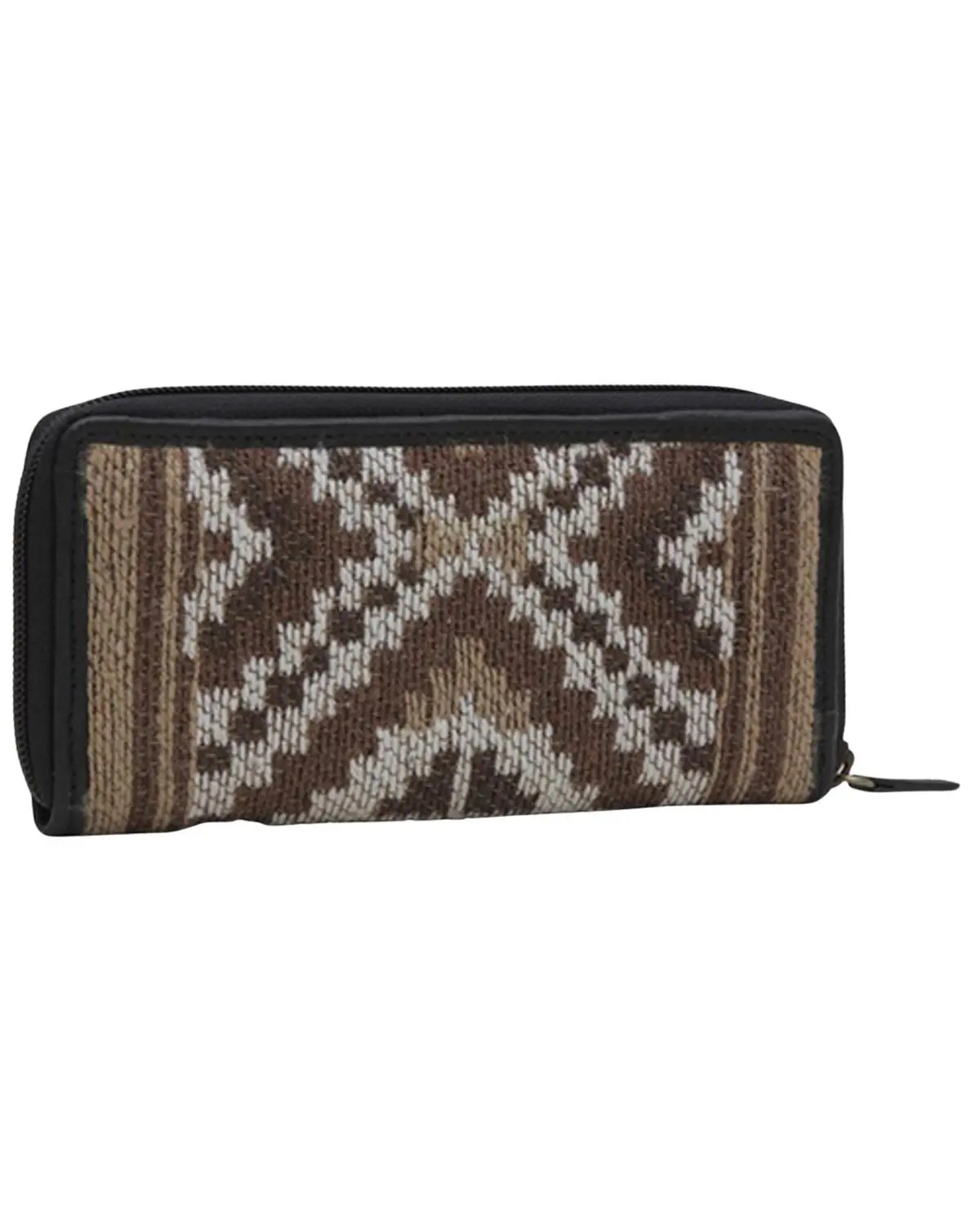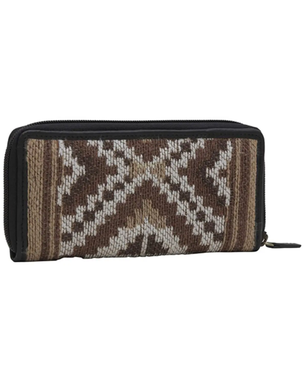 4" H x 7.75" W. Zipper closure. Brown, tan and gray woven design. 8 credit card slots, 2 money slots and 1 zippered pocket on interior. Imported.