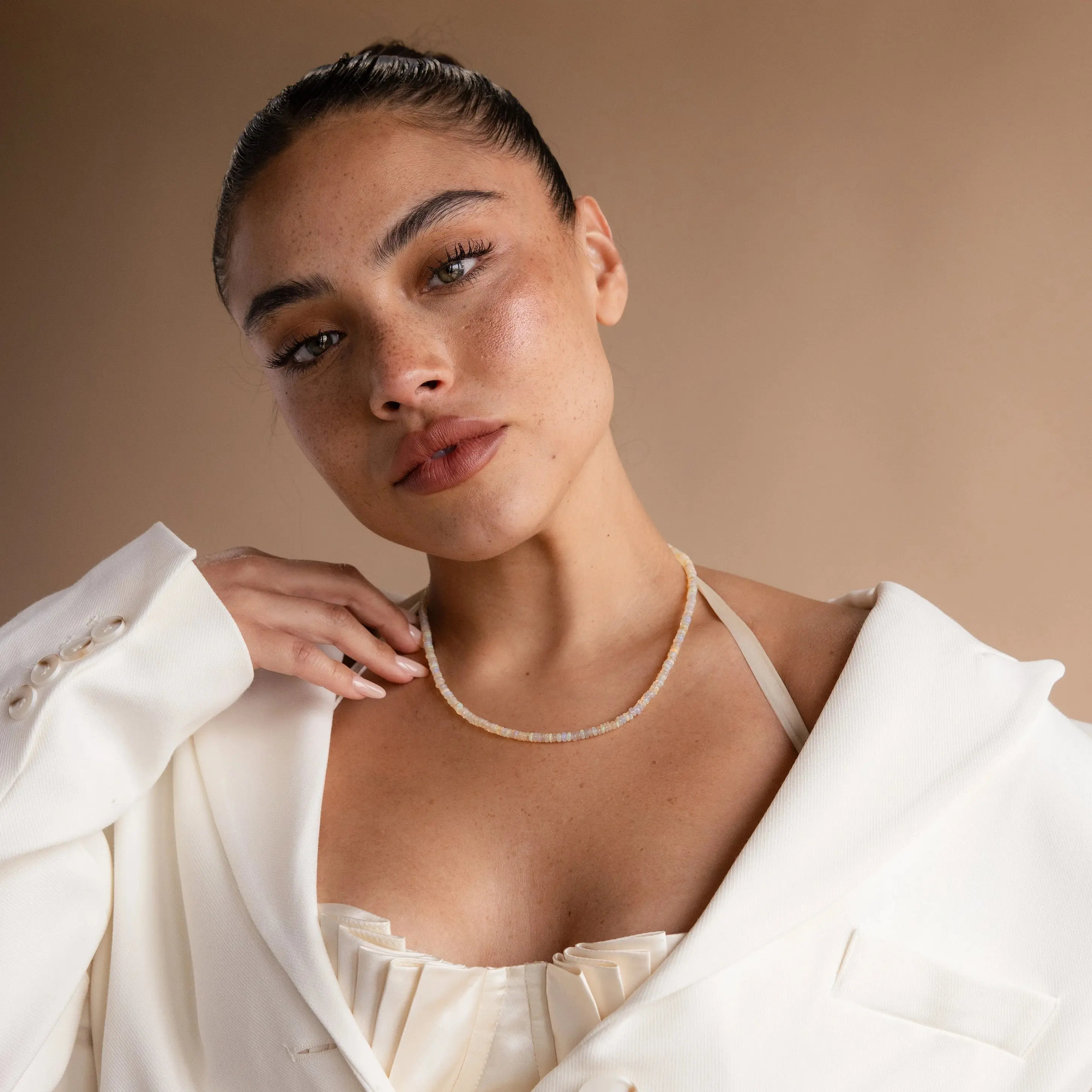 Illuminate your summer look with our Opal Beaded Necklace, featuring opals that capture and reflect light with a mesmerizing iridescence. Each bead shimmers with a radiant glow, adding a touch of bohemian charm and beauty to your sunny day style.