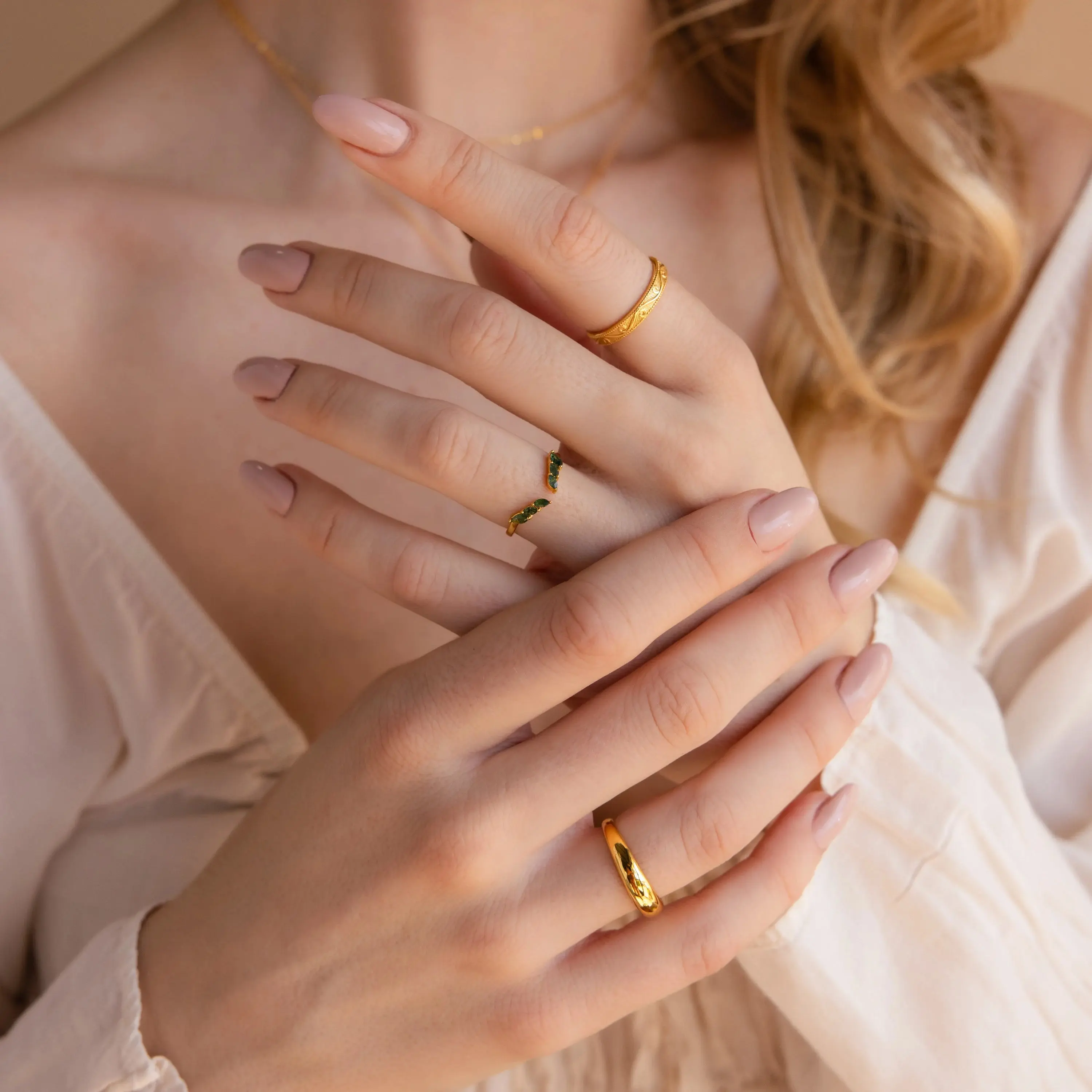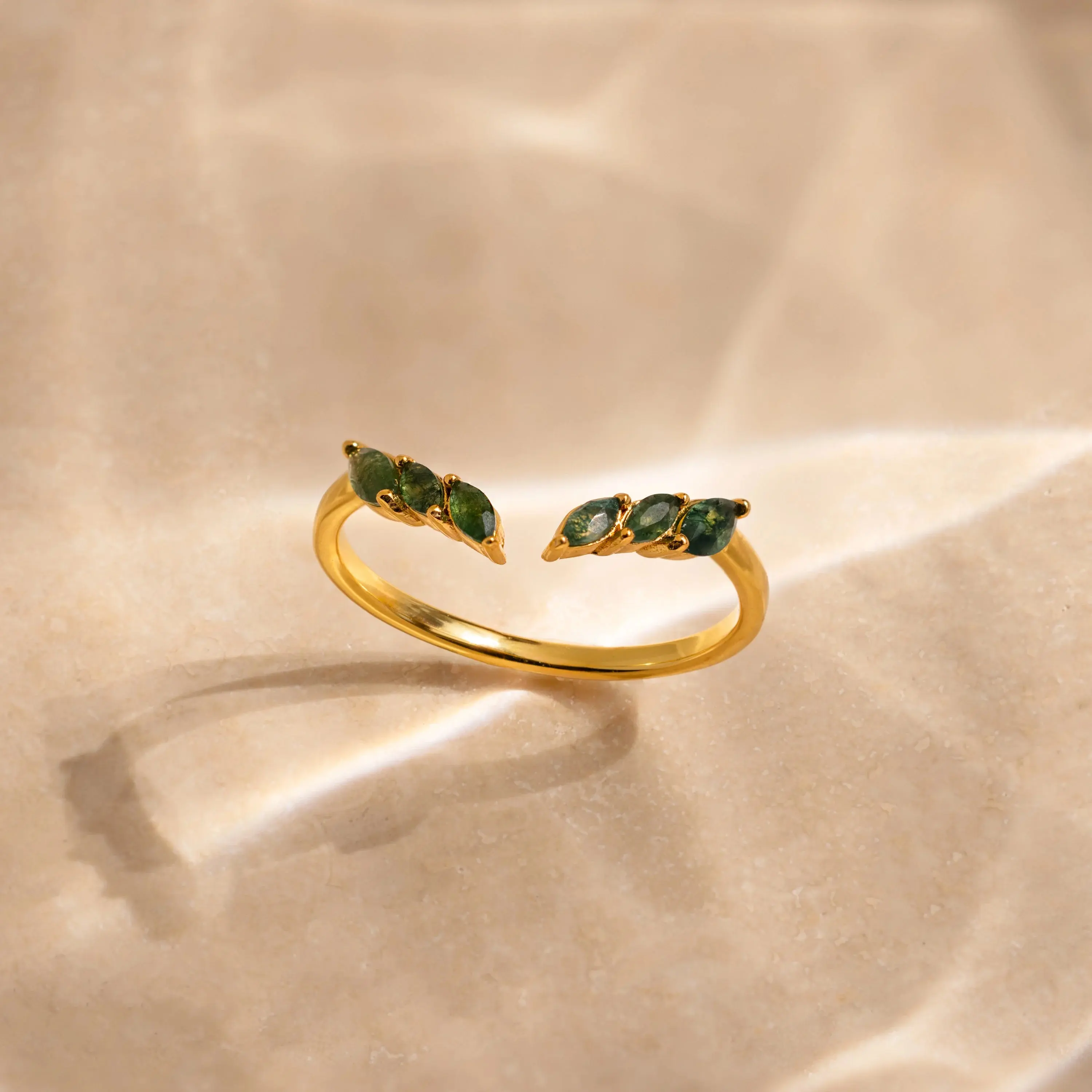 Our Open Moss Agate Chevron Ring showcases marquise-cut gemstones on a delicate, curved band, blending sophistication with deep, earthy tones. Ideal as a unique promise ring or special treat for yourself, this dainty ring adds a touch of nature-inspired elegance to your everyday style ♡