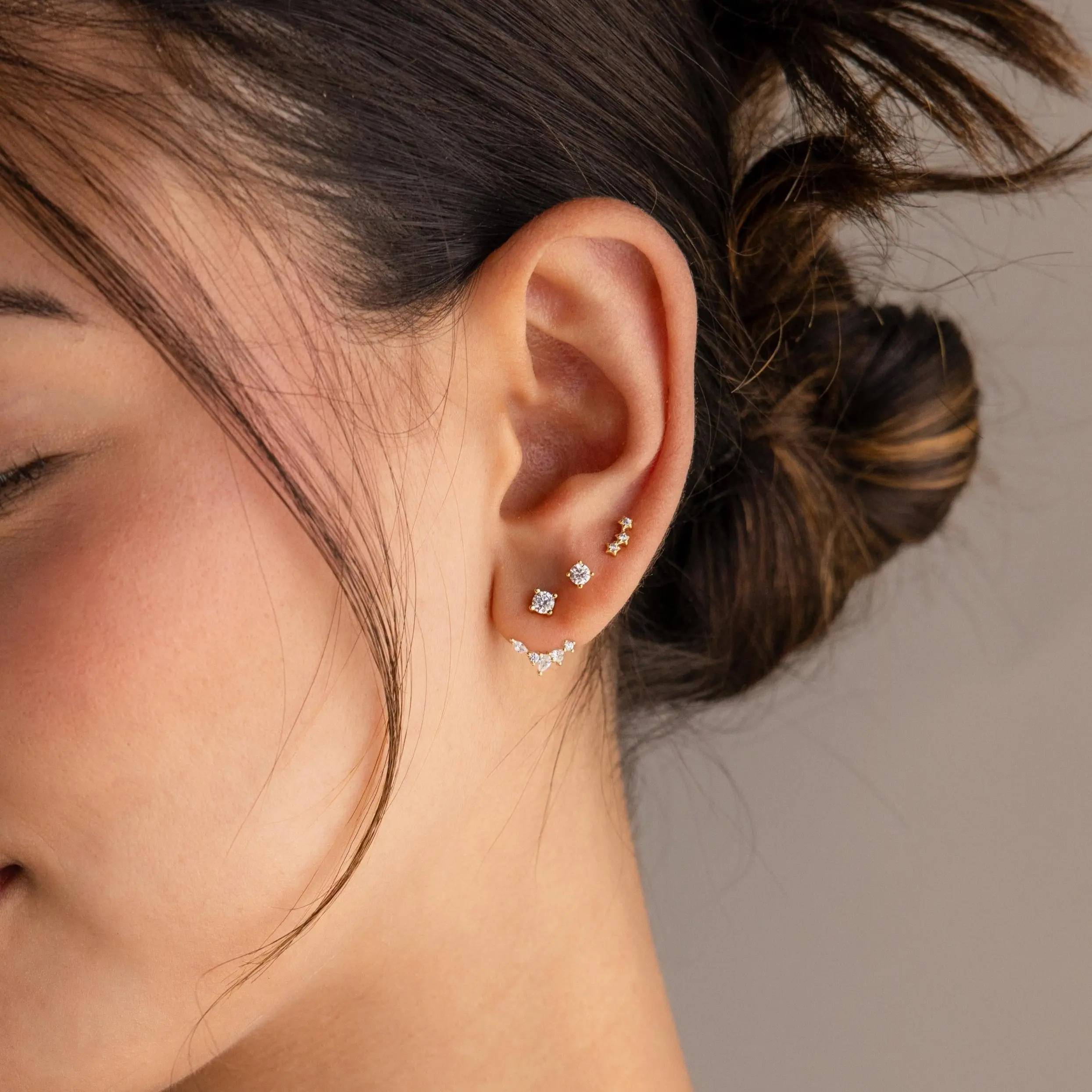 ·Model showcases a charming, delicate stacking look featuring our Stella Star Studs and Booker Tiny Diamond Studs.