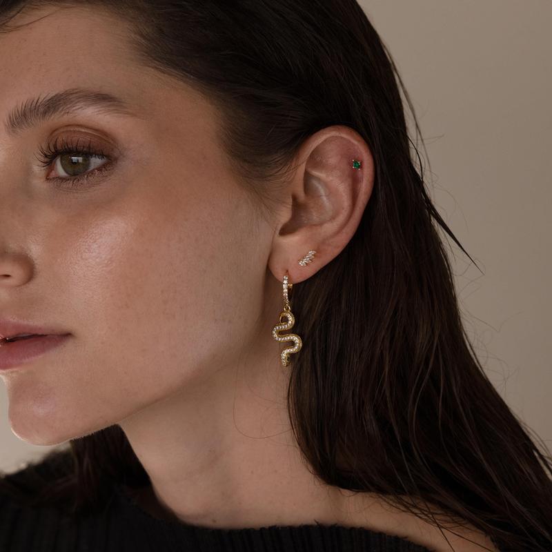 Elevate your style with the Pave Snake Charm Huggies. Featuring intricate snake charms and sparkling gemstones, these bold diamond hoops blend edgy sophistication with timeless elegance. Perfect as a gift or a treat for yourself, they add charm and sparkle to any look.