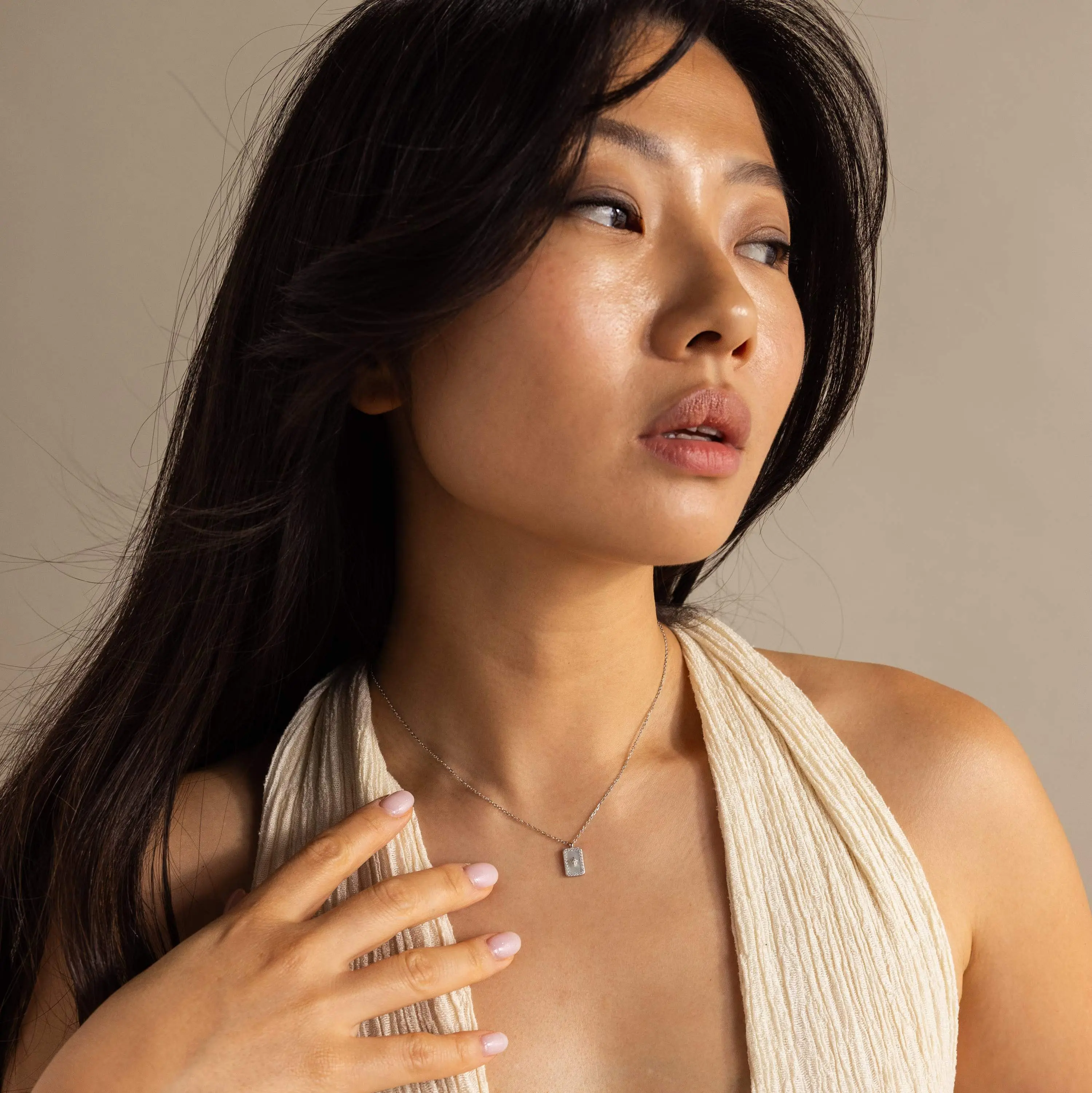 ·Model showcases an elegant, celestial layering look featuring our Alice Thin Snake Chain and Square Diamond Figaro Necklace.