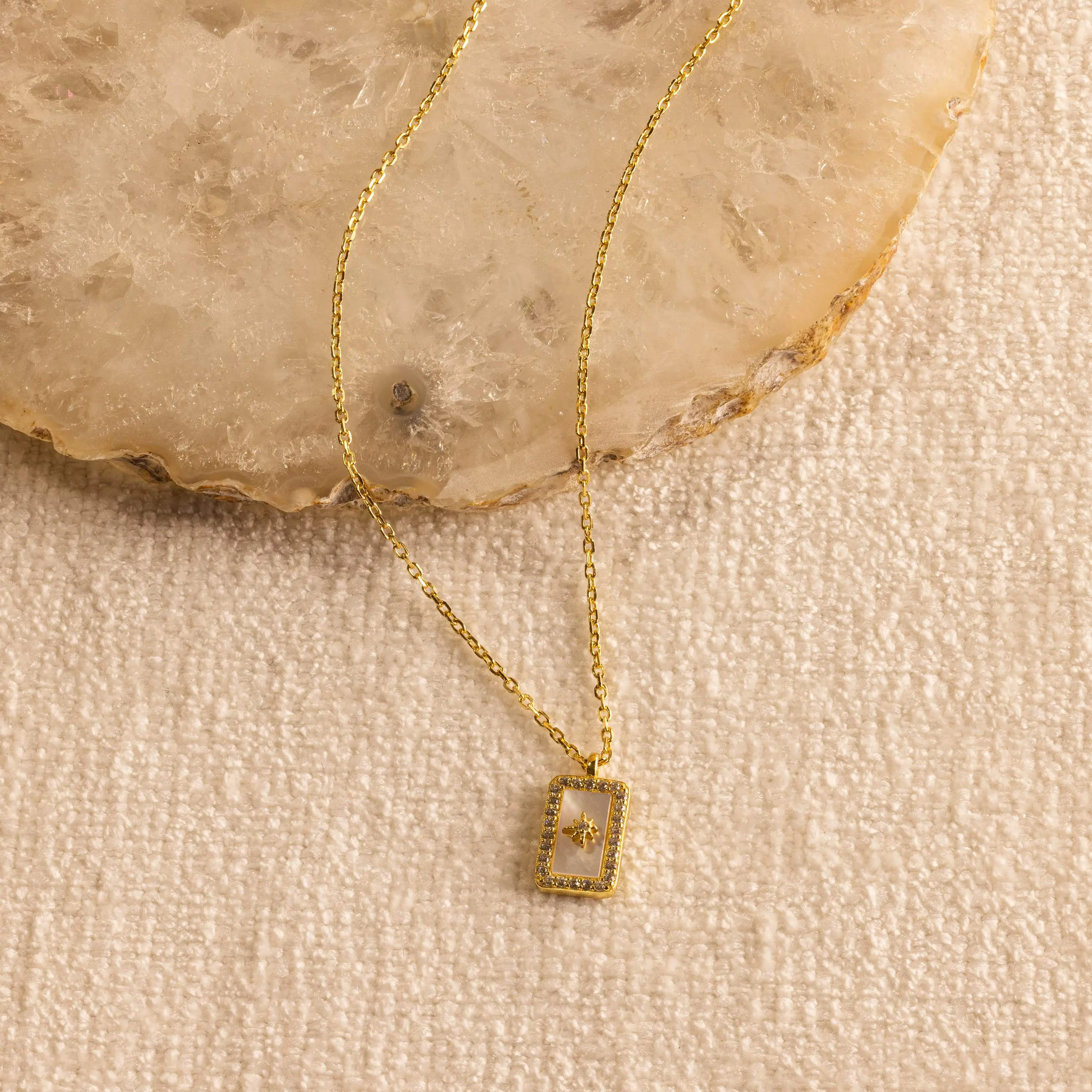 Our Pave Pearl North Star Necklace features a delicate North Star design with a luminous Mother of Pearl inlay, exuding elegance and celestial charm. Symbolizing guidance and hope, this unique piece is perfect for special occasions or as a meaningful everyday accessory.