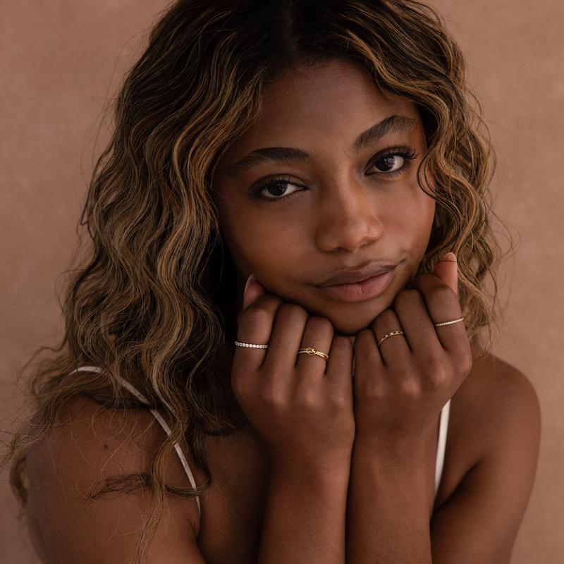 ·Featured Styles: Model showcases a refined, dazzling diamond look featuring our Eternity Tennis Birthstone Ring, Diamond Station Ring, and Dove Eternity Ring