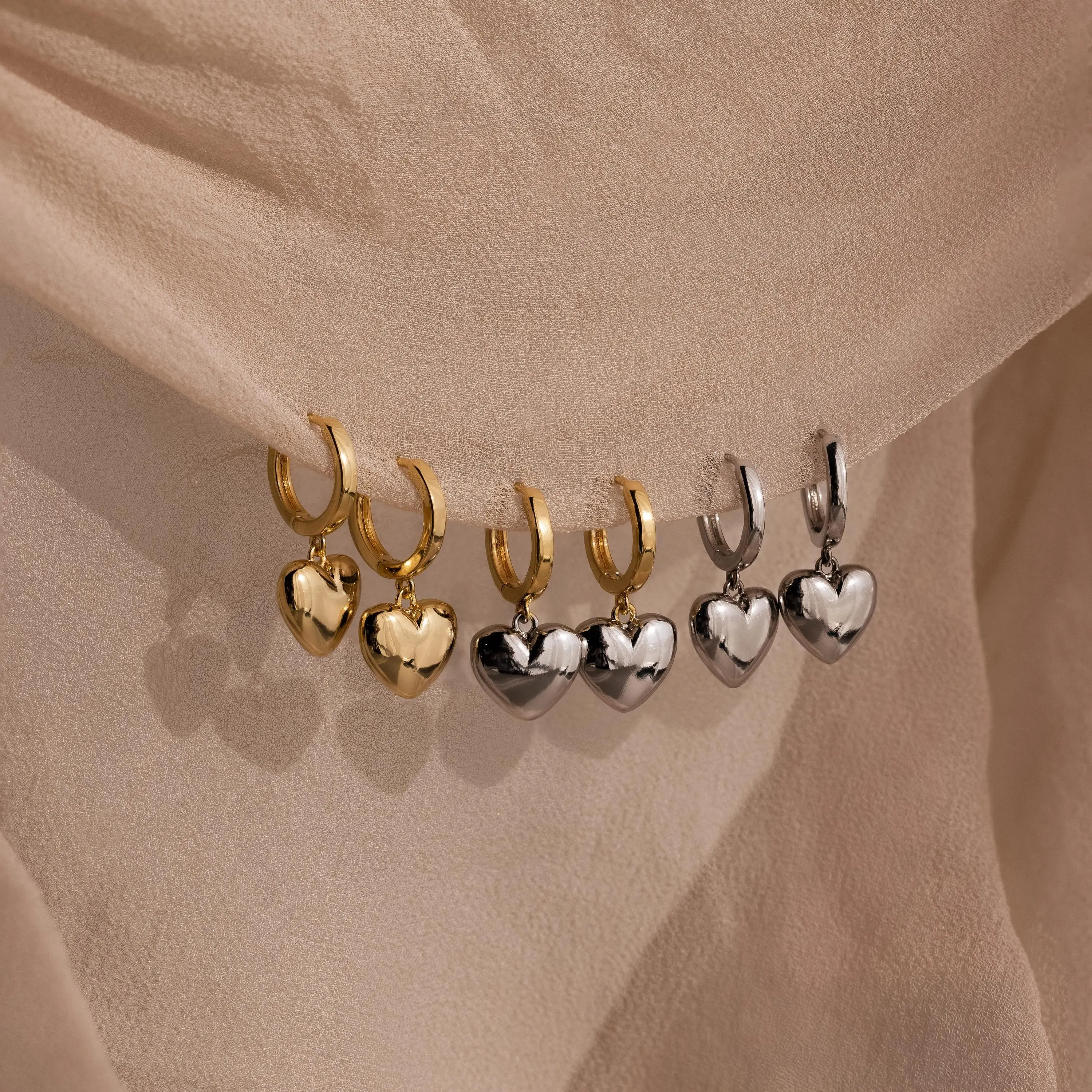 ·Featured Styles: Model showcases a bold, romantic look featuring our Classic Heart Studs, Mini Diamond Sprinkle Huggies, and Mini Hammered Hoops Set.