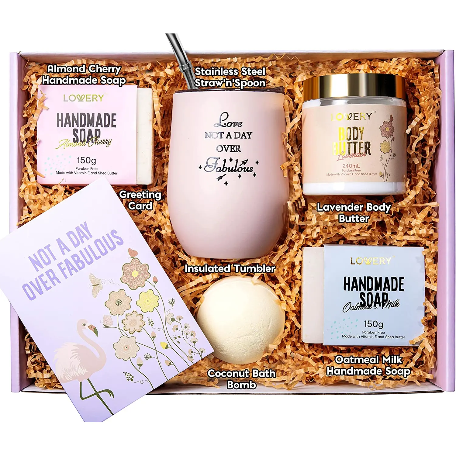 This Gift Box comes with 12oz Insulated Stainless Steel Tumbler with the words "Love Not A Day Over Fabulous" permanently laser engraved, Stainless Steel Straw and Spoon, 150g Almond Cherry Handmade Soap, 240ml Lavender Body Butter, 150g Oatmeal Milk Handmade Soap, 150g Coconut Bath Bomb and a Personalized Greeting Card for you to write that Heartfelt Message.