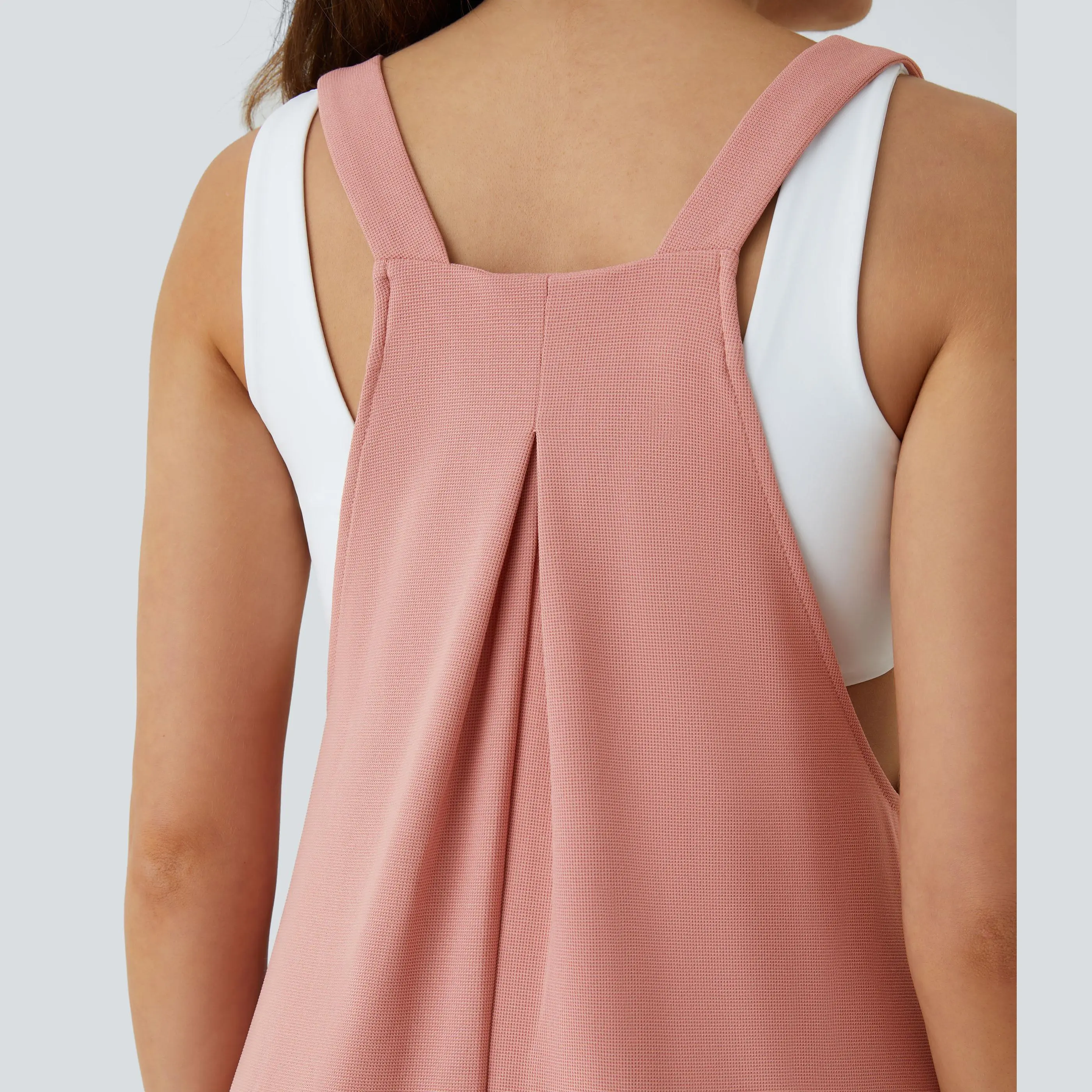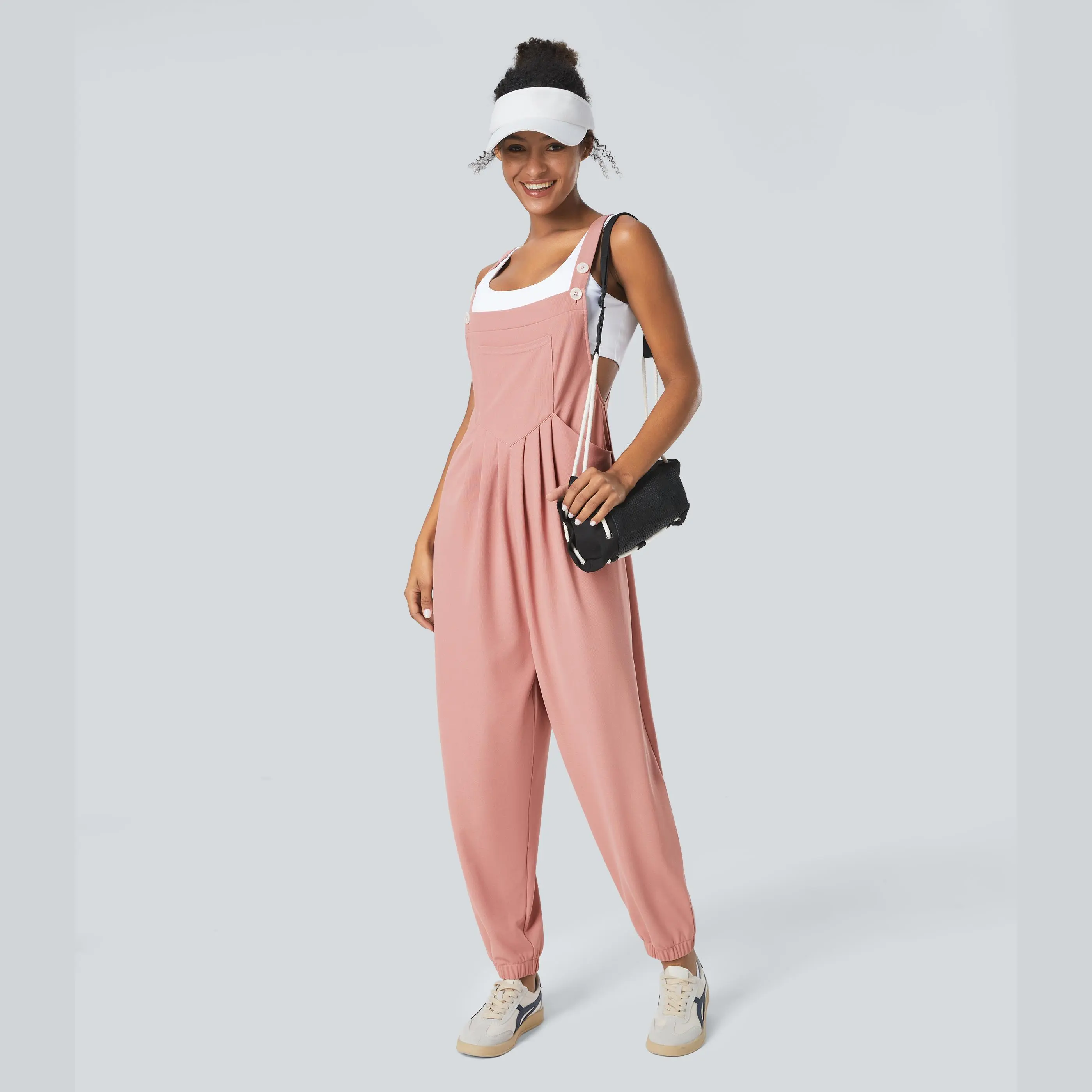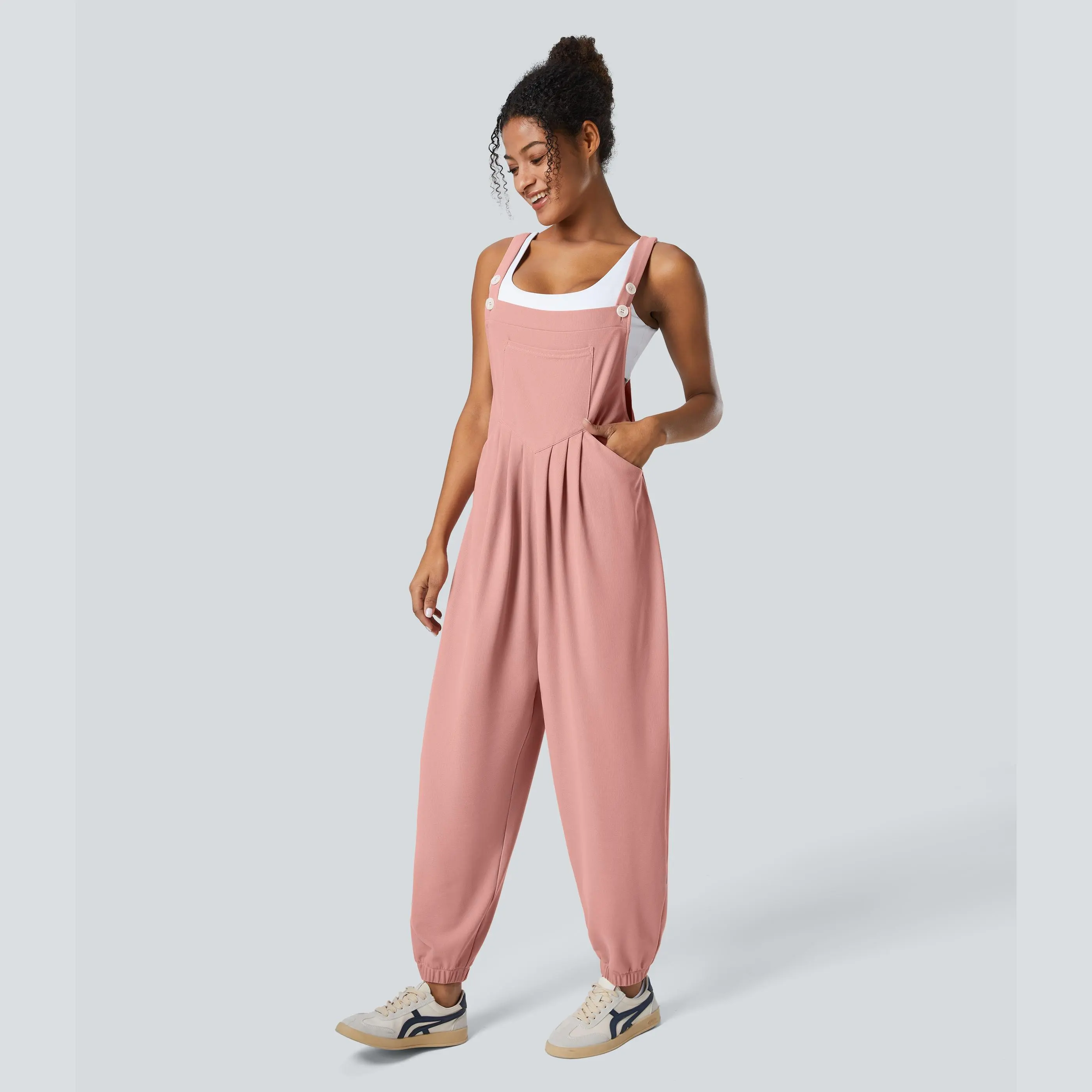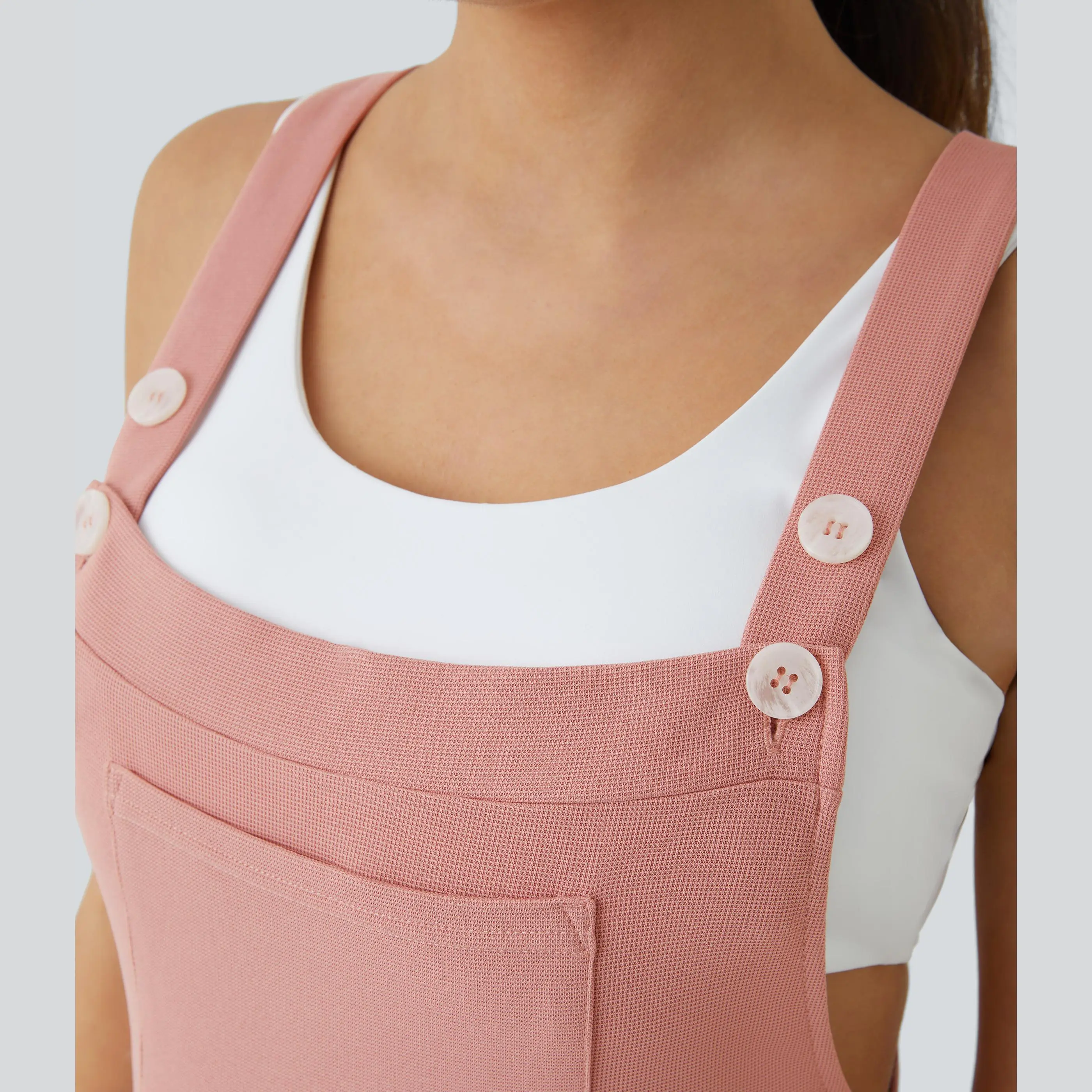·Features: Adjustable straps for easy customization and comfortable wear. Who said buttons were just for function? These are designed with cute button placement. Multiple pockets for easy storage. Designed with plicated tailoring for a textured look. Waffle fabric provides loose comfort and gives added texture to your look. Designed with 2-way stretch fabric.